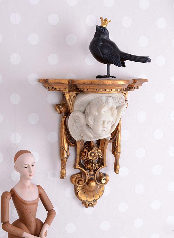 Piękna naścienna konsolka w stylu barokowym. Niewielka półka o fantazyjnej linii została osadzona na bardzo dekoracyjnej podpórce. Połączenie motywów roślinnych z kształtem opadającej swobodnie tkaniny, tworzy oprawę dla reliefowego wizerunku anioła. Głowa z bujnymi lokami wygląda jakby otulały ją skrzydła.