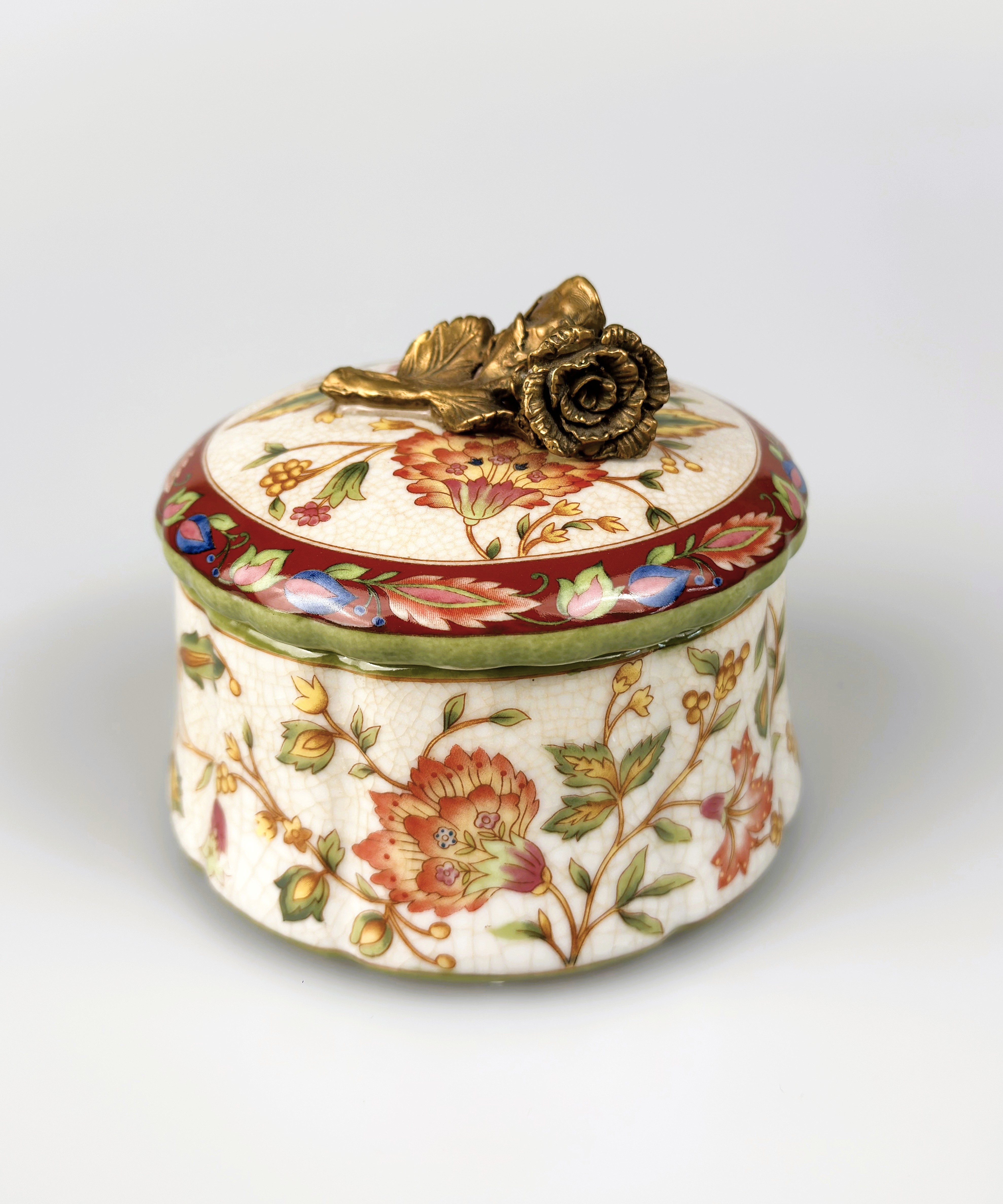 Bomboniera zdobiona pięknymii motywami roślinnymi nawiązującymi do sztuki zdobniczej XIX wieku . Porcelana o krakelurowym szkliwie ma podkreślać historyczny charakter przedmiotu. Uchwyt dekielka w formie gałązki róży z ręcznie cyzelowanego brązu. Dobry pomysł na elegancki upominek przy różnych okazjach.