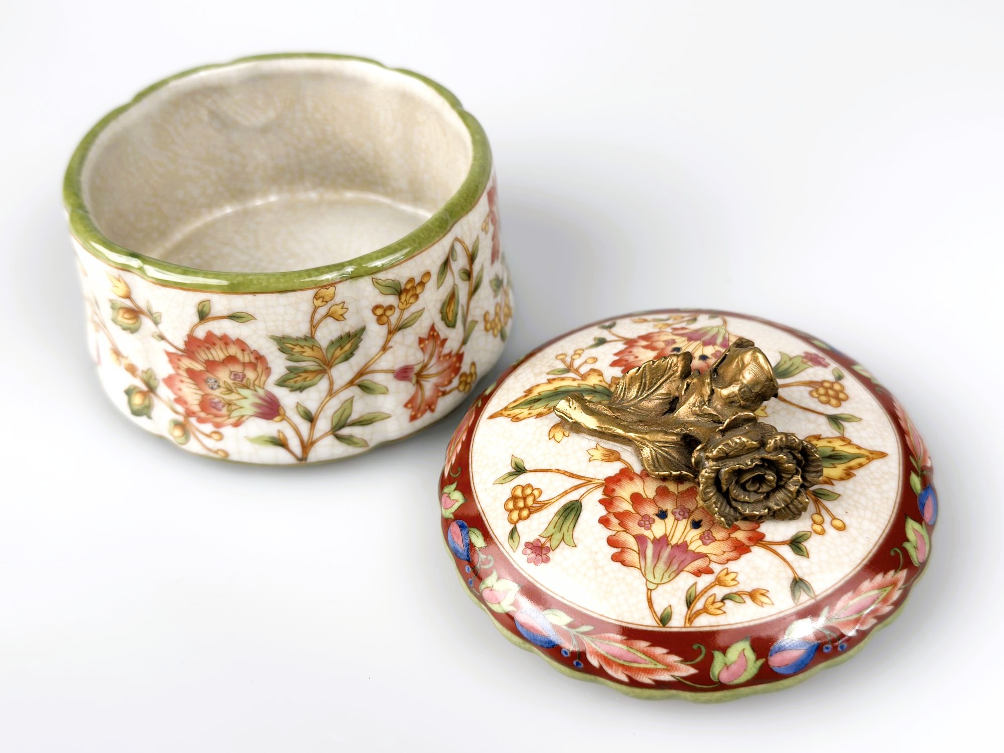 Bomboniera z Różą Motywy Kwiatowe porcelana i brąz