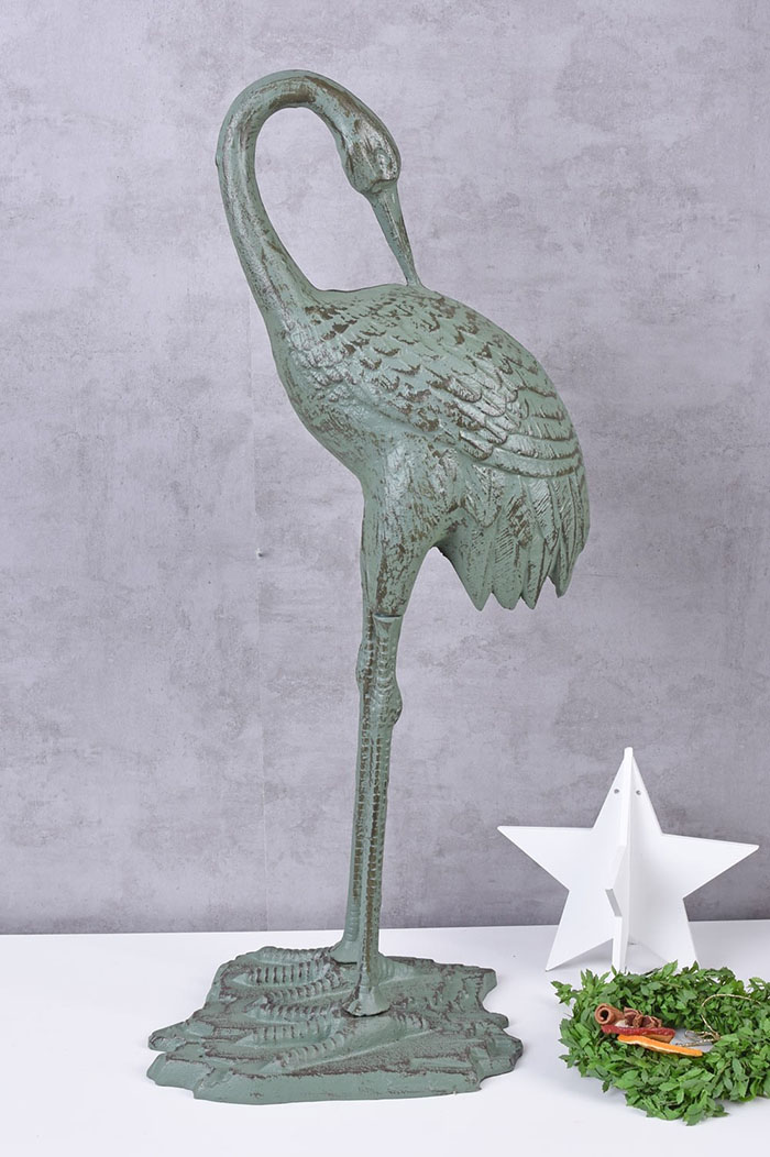Czapla, figura ogrodowa z żeliwa. Sprawdzi się nie tylko na otwartej przestrzeni, ale również na obszernym balkonie, w holu lub na tarasie. Dzięki swojej wadze (około 9 kg), znacznie zyskuje na stabilności.
