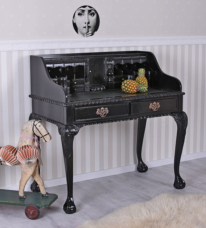 Czarny sekretarzyk w stylu Chippendale. Konsola z dwiema szufladami osadzona na nogach ze snycerskimi dekorami. Dzięki niezwykle praktycznej nadstawce z ośmioma szufladkami, małą szafeczką w centralnej części i mnóstwem przegródek, szufladek i tajemnych skrytek (ponad 20 !), sekretarzyk staje się jeszcze bardziej funkcjonalny.
