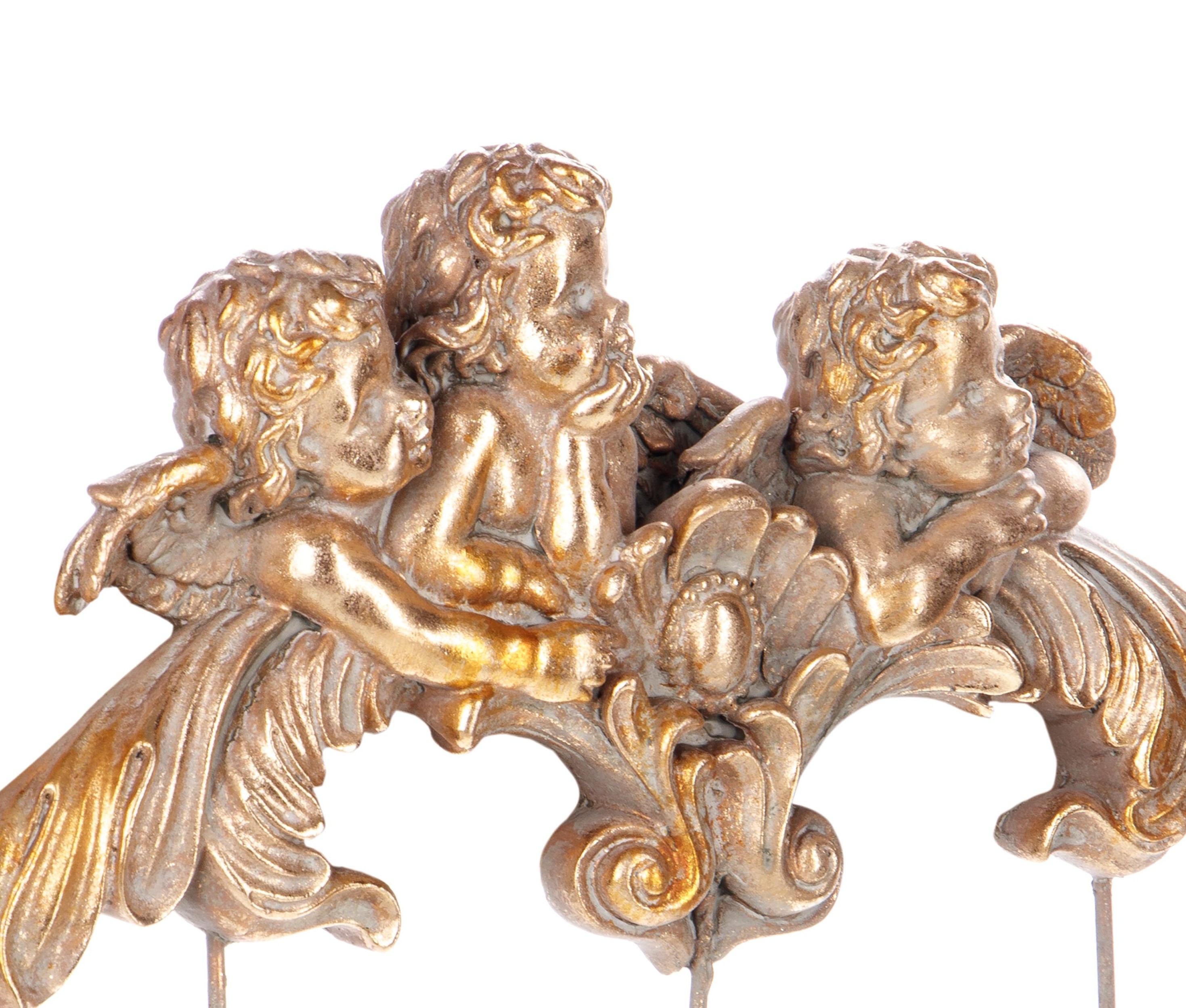 Stylowy wieszak w formie trzech puttów otoczonych ornamentem roślinnym, utrzymany w barokowym charakterze. Opracowany w optyce złota, celowo postarzany przez przecieranie, patynowanie, imitację przebarwień, co ma podkreślać jego historyczny charakter i sprawia, że każdy egzemplarz ma niepowtarzalny wygląd. Delikatnie połyskujące wykończenie podkreśla detale figurek i nadaje całości elegancki, klasyczny wygląd.