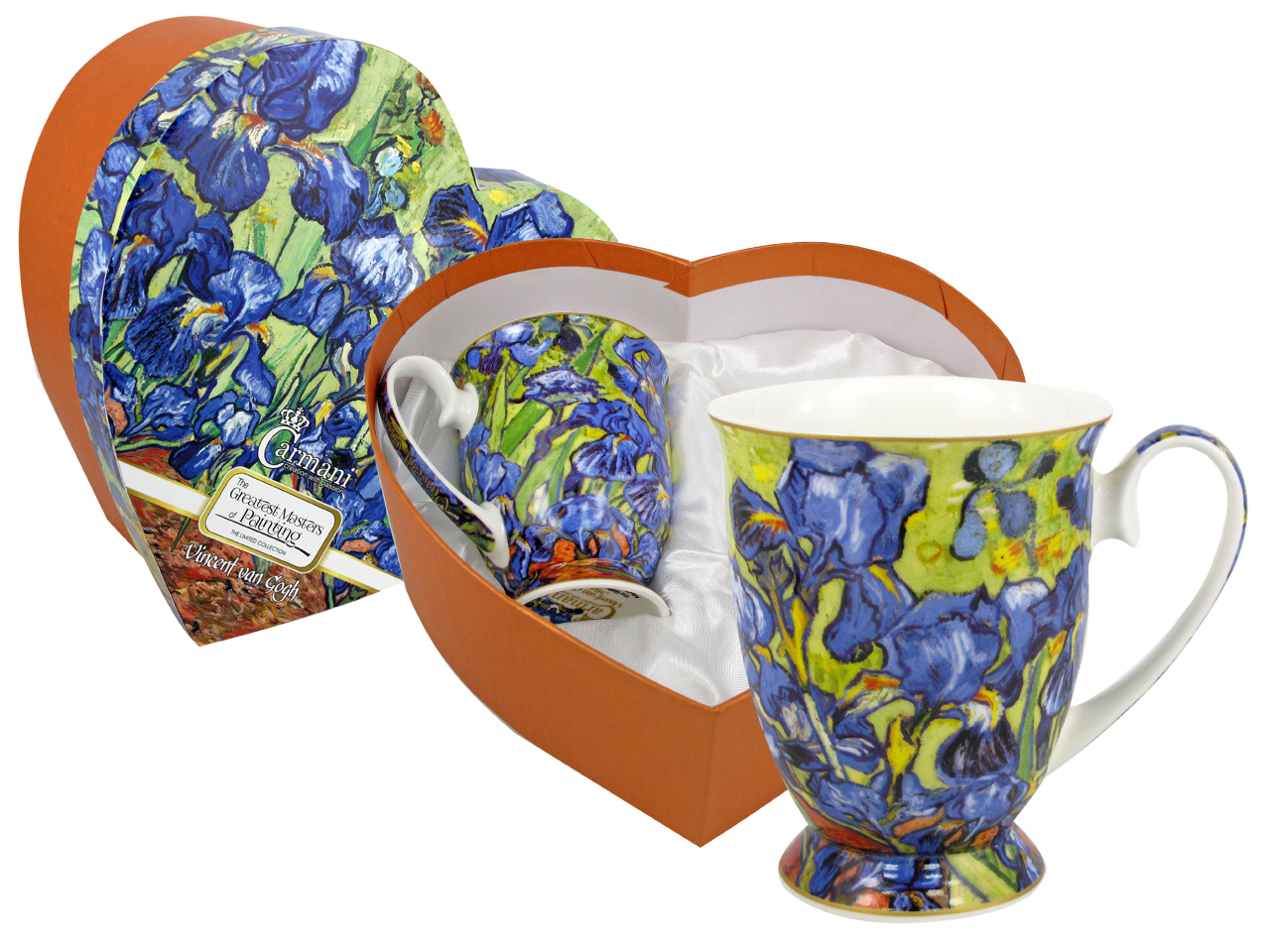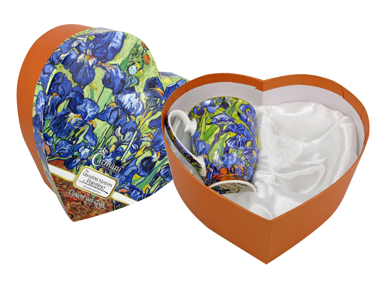 Zestaw upominkowy. W dekoracyjnym, wyściełanym pudełku w kształcie serca są dwa kubki zdobione znanym motywem z obrazu "Irysy" autorstwa wybitnego malarza holenderskiego Vincenta van Gogha (1853 - 1890). Zestaw polecany na romantyczny upominek przy różnych okazjach.