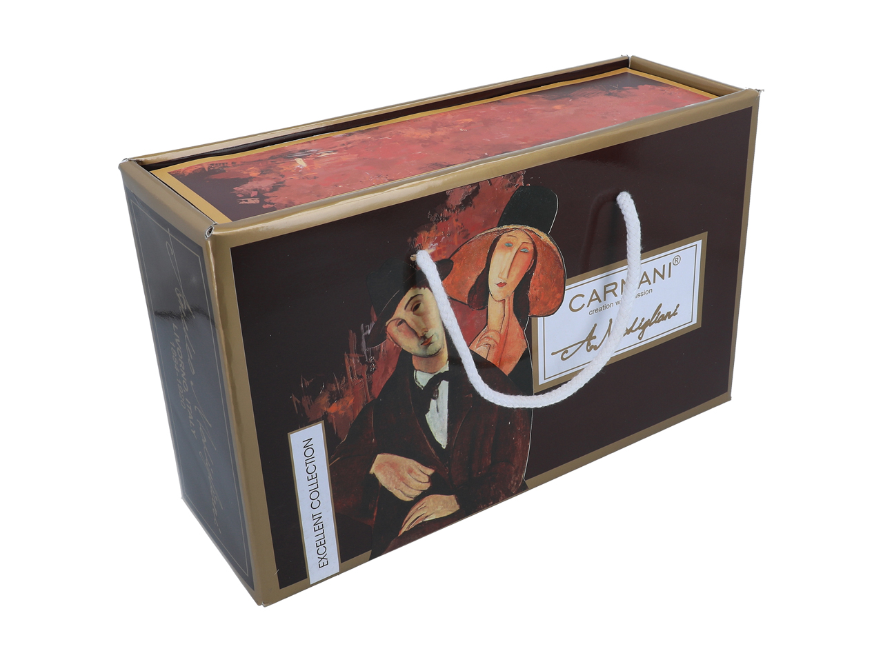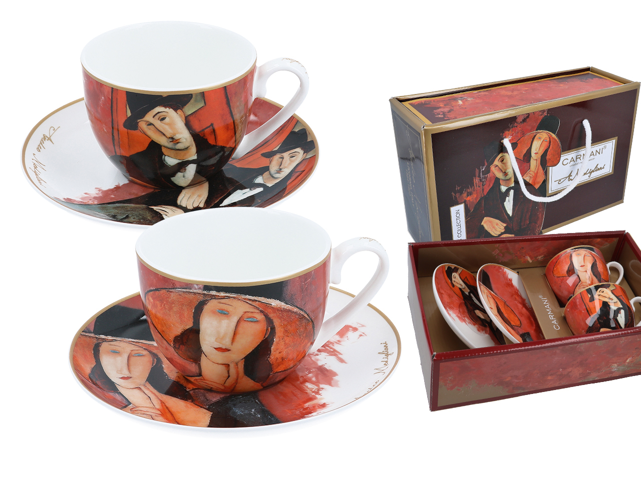 Komplet dwóch filiżanek z podstawkami inspirowany malarstwem Amedeo Modiglianiego (1884 - 1920) to elegancki zestaw o artystycznym charakterze. Charakterystyczne, rozpoznawalne motywy w ciepłej czerwonej tonacji nadają całości wyrafinowany, dekoracyjny wygląd. Zestaw umieszczony jest w ozdobnym pudełku z uchwytem, które podkreśla jego prezentowy charakter.