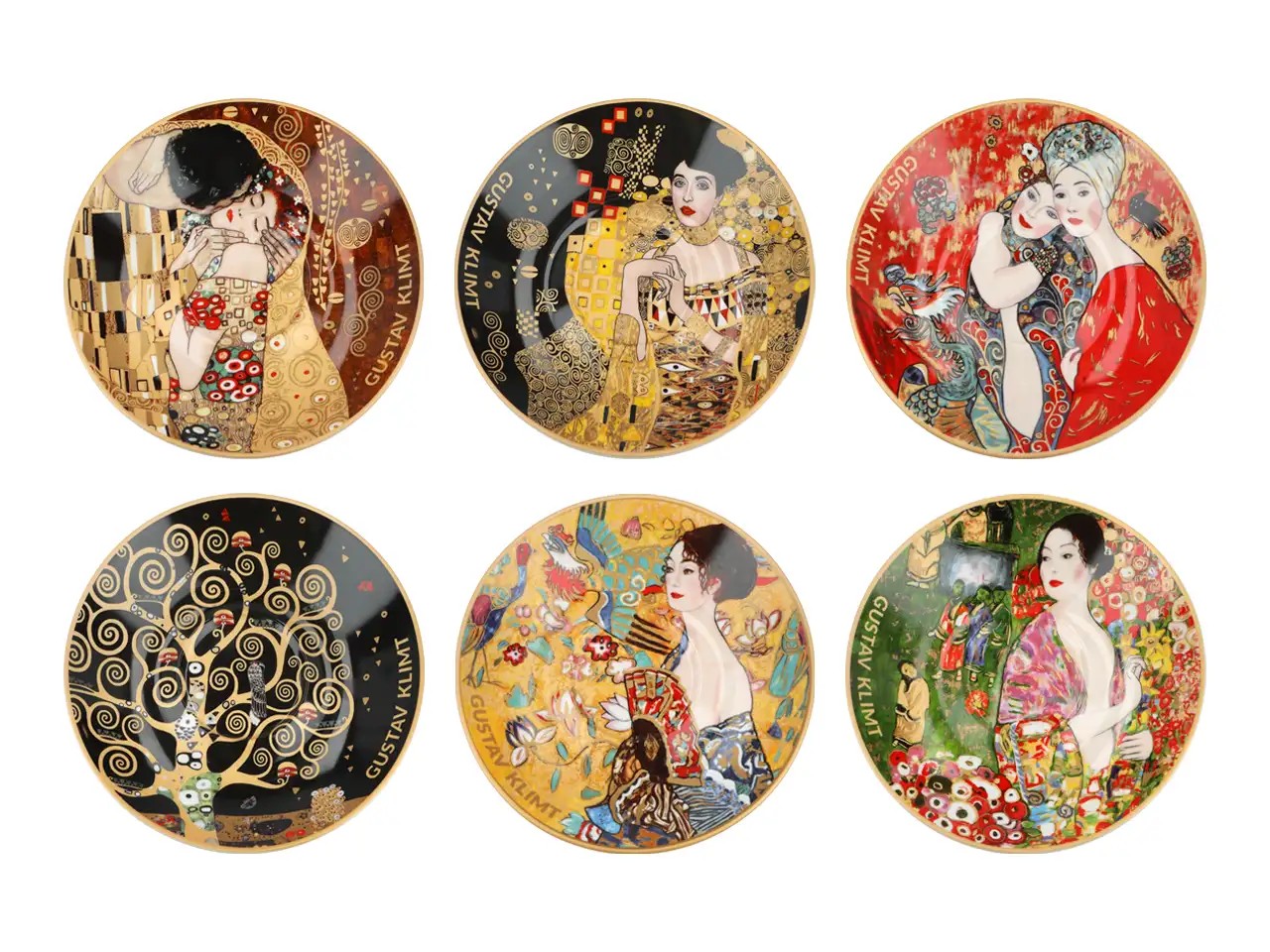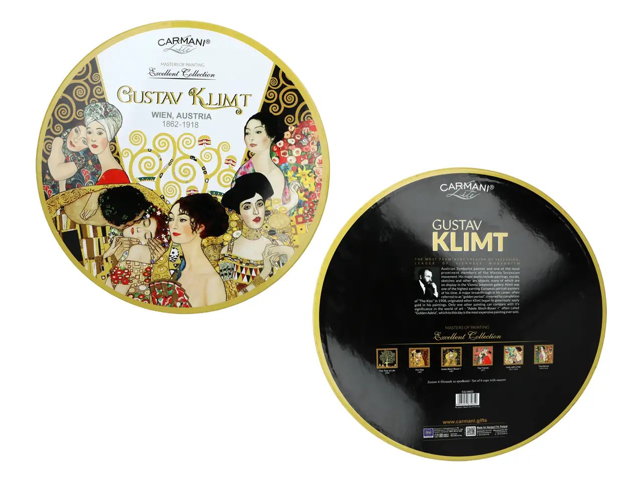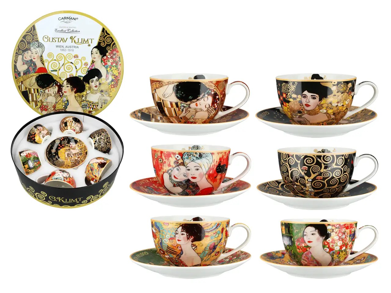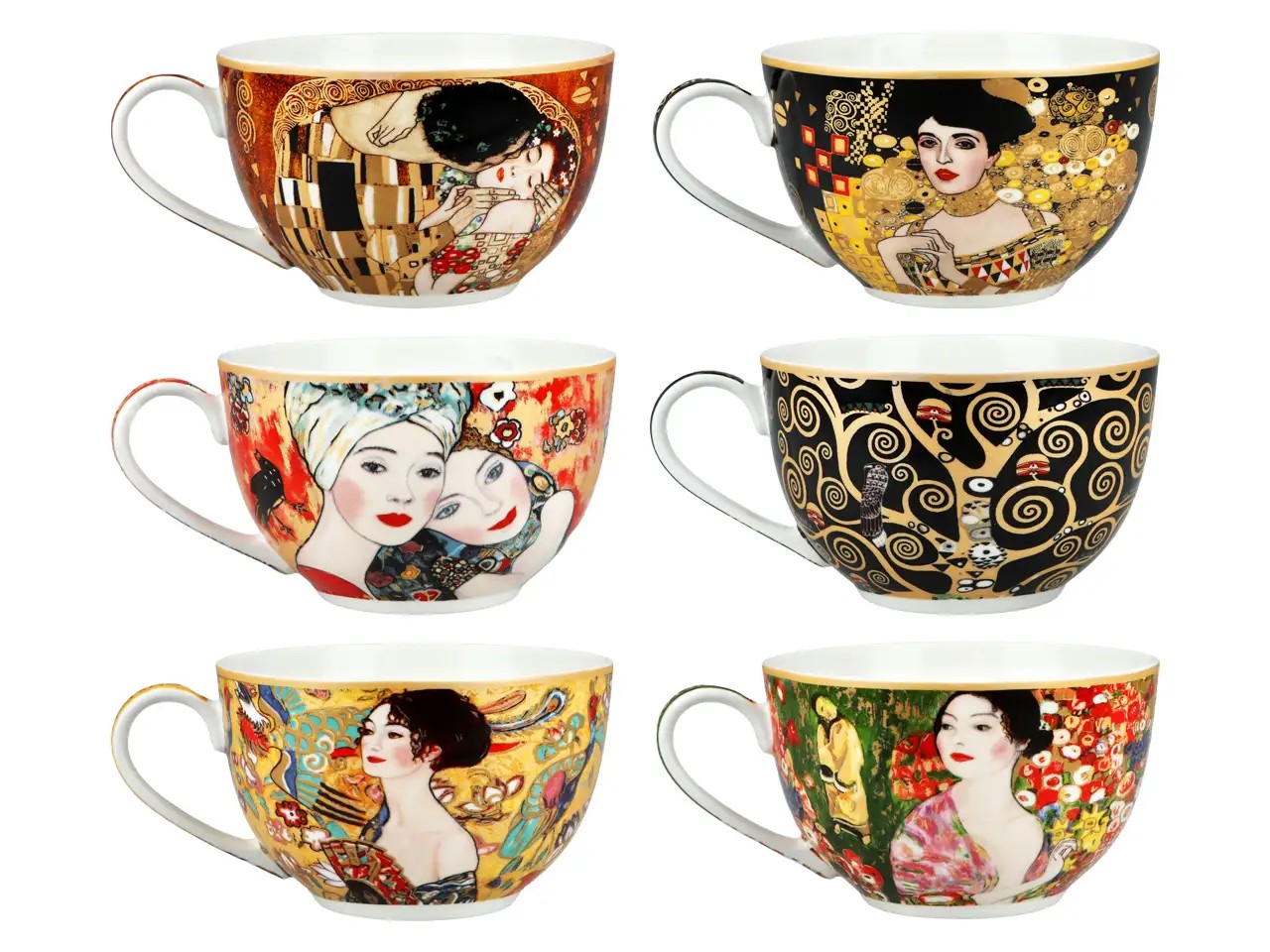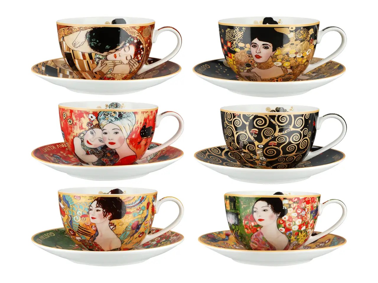 Komplet 6 filiżanek z podstawkami inspirowanych twórczością Gustava Klimta (1862-1918) to elegancka propozycja dla miłośników sztuki secesyjnej. Każda filiżanka wraz z dopasowanym podstawkiem zdobiona jest innym motywem nawiązującym do najbardziej znanych dzieł artysty, pełnych złota, ornamentów i zmysłowej kobiecej estetyki.
