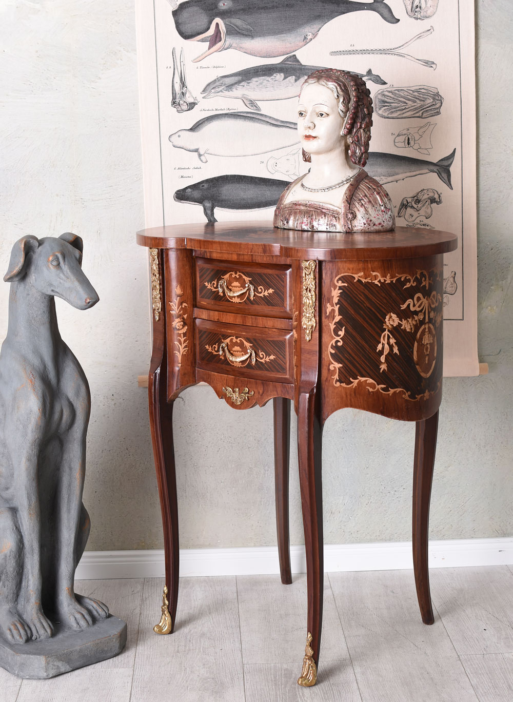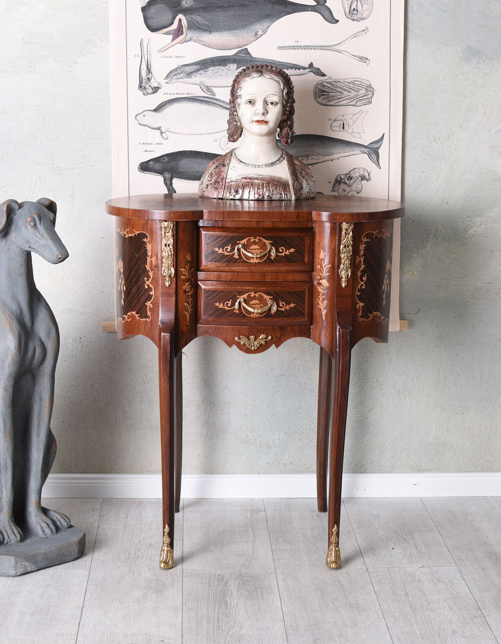 Elegancka konsolka w stylu barokowym o wyrafinowanej formie. Front oraz boki zdobią misternie wykonane intarsje o motywach roślinnych, które w połączeniu z rysunkiem naturalnego forniru tworzą pełną harmonii kompozycję. Złocone aplikacje z mosiądzu dodają całości szlachetnego blasku i klasycznego wdzięku.