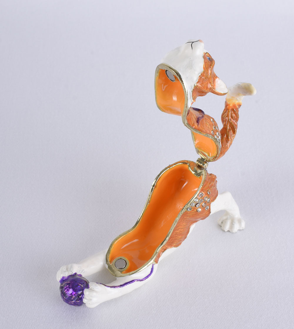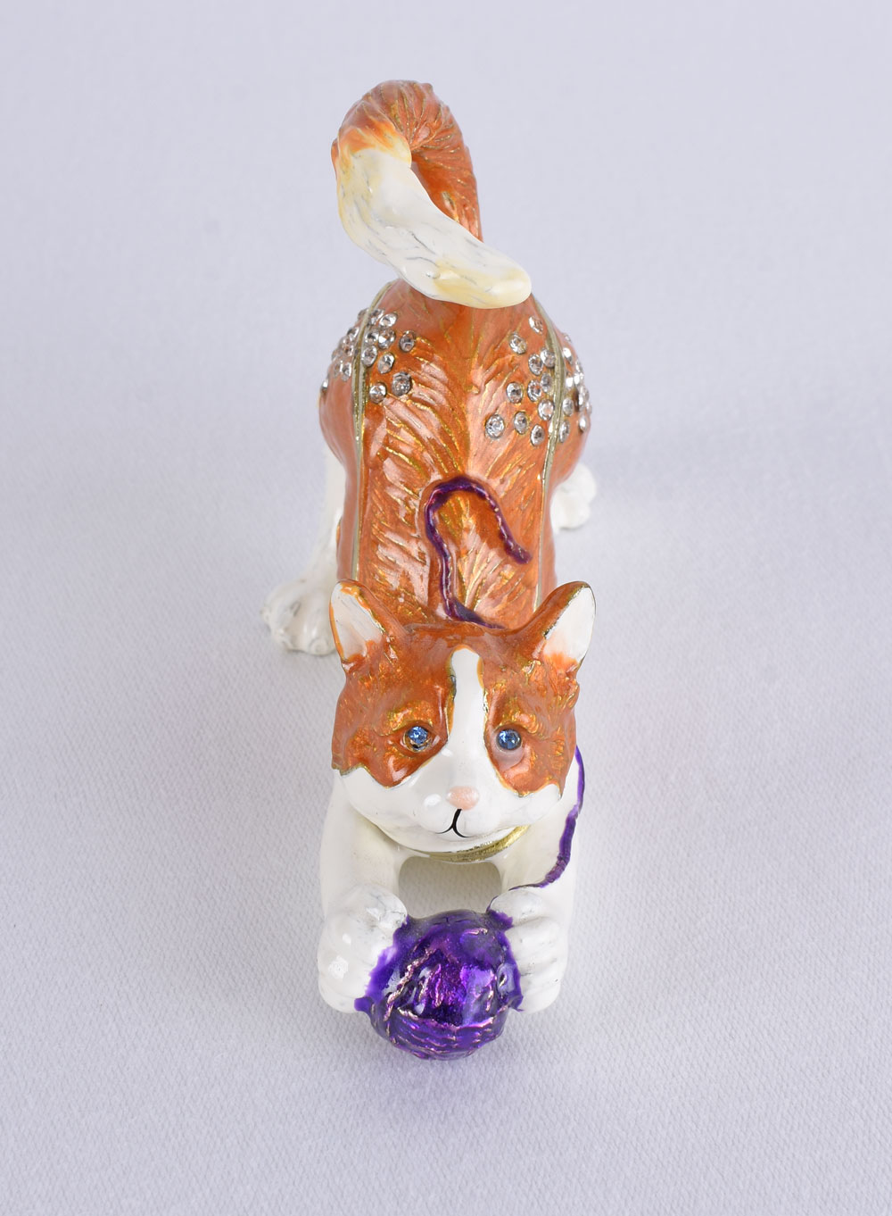Urocza szkatułka w stylu Faberge, wykonana techniką emaliowania metalu i wysadzana półszlachetnymi kamieniami. Przedstawia przeciągającego się biało-rudego kotka z fioletowym kłębkiem między łapkami. Oczy z osadzonych pojedynczych kamieni mienią się, jak u prawdziwego kota. Jasne kamienie na udach dodają całości szyku i są synonimem luksusu.