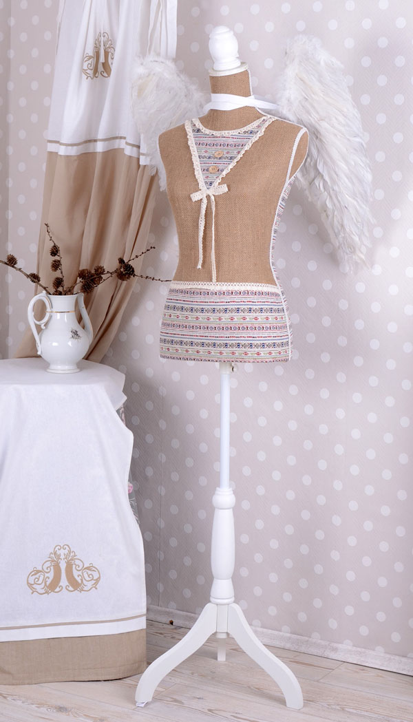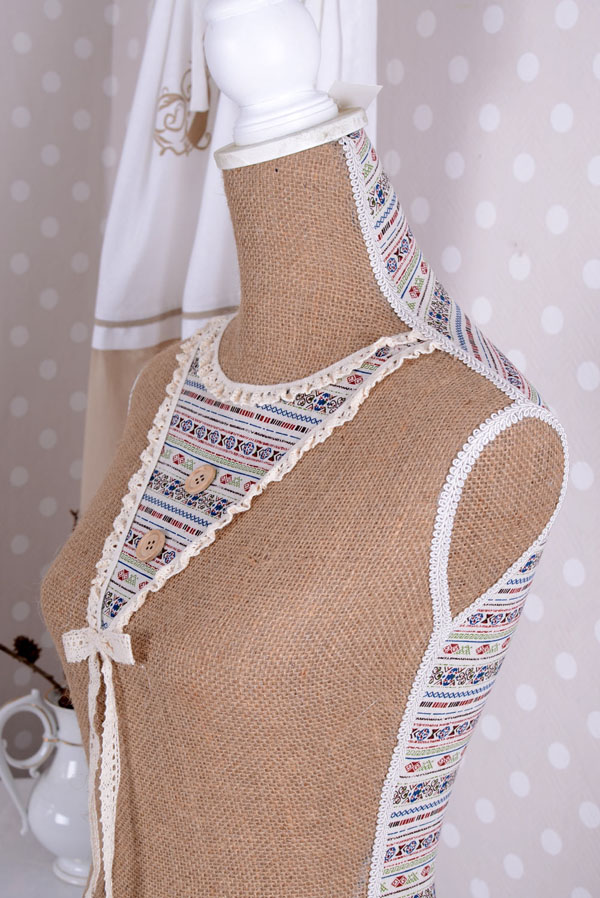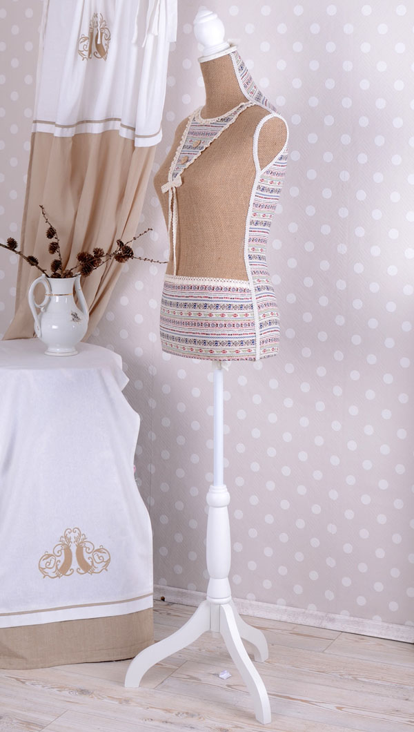 Manekin krawiecki w stylu vintage. Korpus obszyty tkaniną o optyce lnianego płótna o grubym splocie. Dół wzbogacony wstawką z wzorzystego materiału, podobnie jak imitacja kołnierzyka. Koronkowe wykończenie i kokardka dodają całości subtelnego uroku. Brzegi korpusu obszyte pętelkową lamówką. Kuliste zakończenie części imitującej szyję, współgra z kolorystyką statywu, w którym umieszczono nogę (wyposażona w regulację wysokości).
