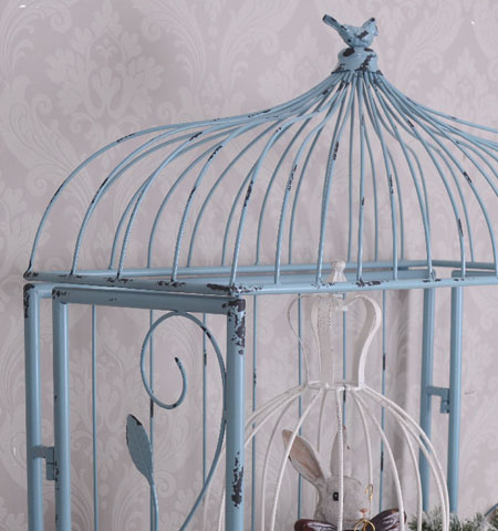 Zjawiskowy metalowy regał w morskiej kolorystyce. Wykonany w całości z żelaza posiada trzy półki z blachy. Tylna ściana zastąpiona pionowymi prętami w regularnych odstępach. Puste boczne ściany zdobione pojedynczymi faliście przechodzącymi łodygami z kilkoma liśćmi. Góra zwieńczona koroną z gęsto ułożonych prętów, na której szczycie siedzi metalowy ptak. Regał w stylu shabby chic, którego podstawowym założeniem jest wykorzystanie przedmiotów starych lub nowych celowo postarzanych. Współcześnie wykonany, poddany patynowaniu, pomalowany na ciemny morski błękit. Farba w wielu miejscach przetarta aż do ciemnej warstwy metalu.