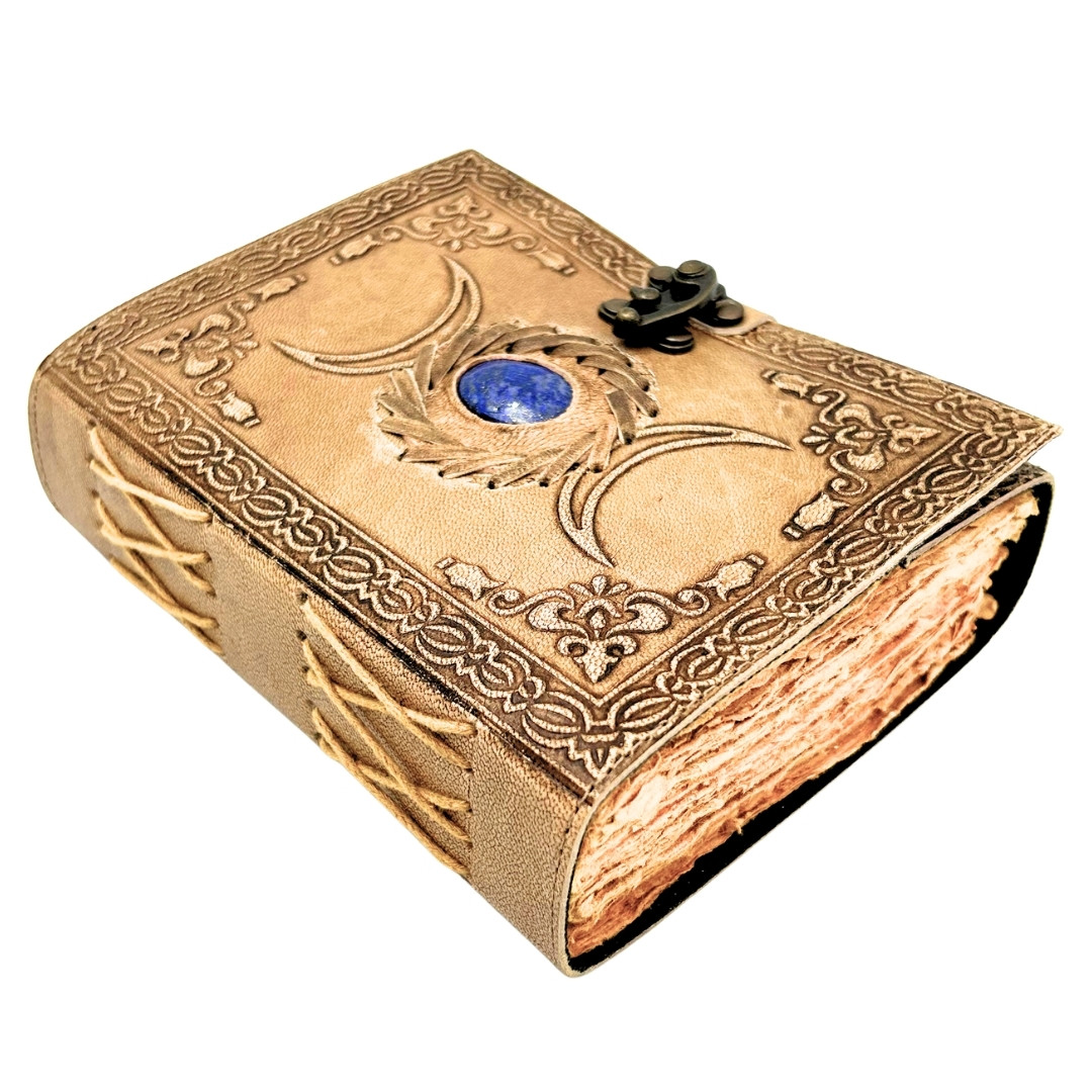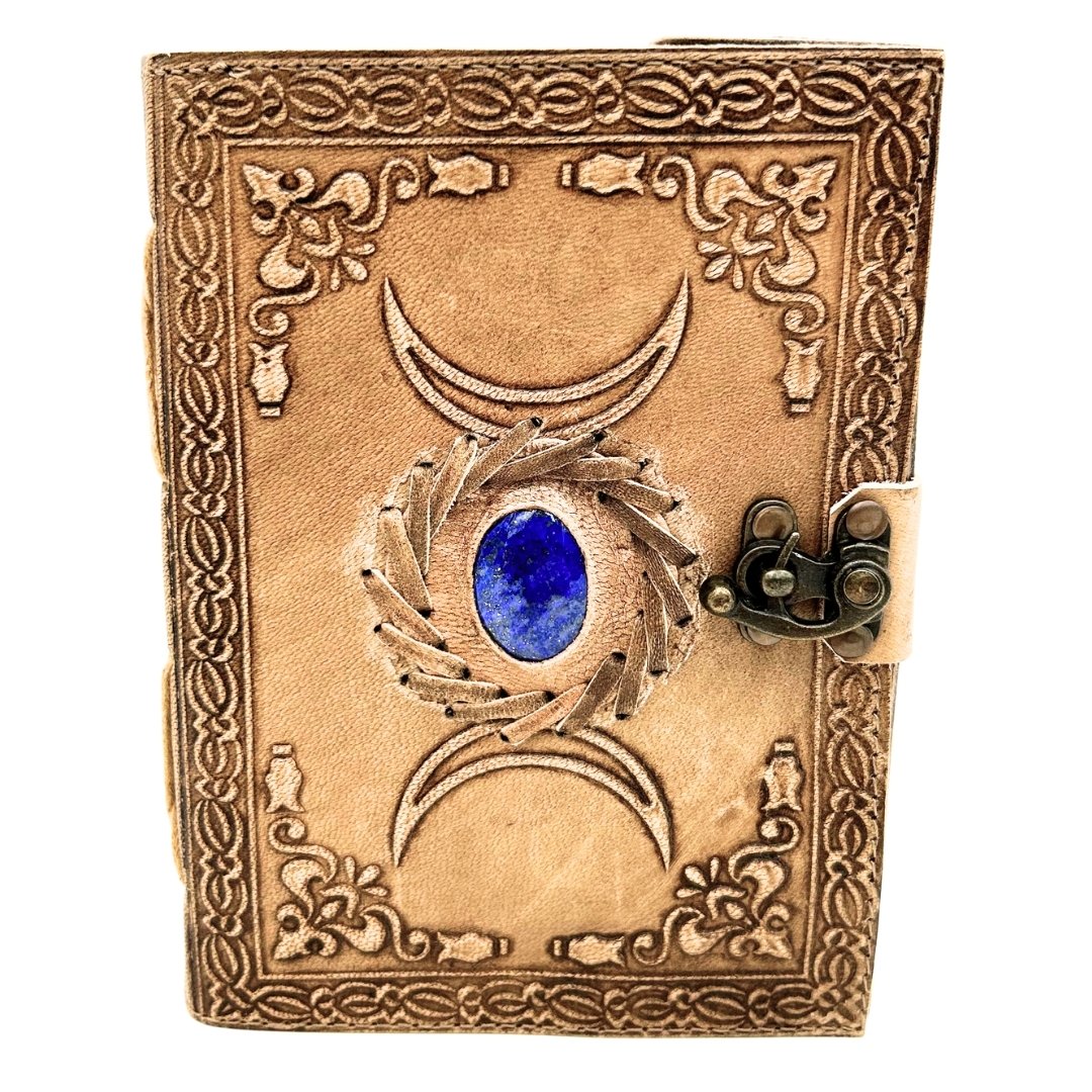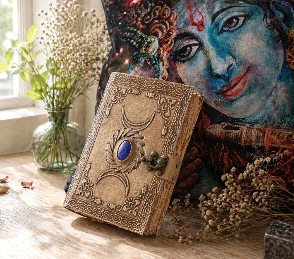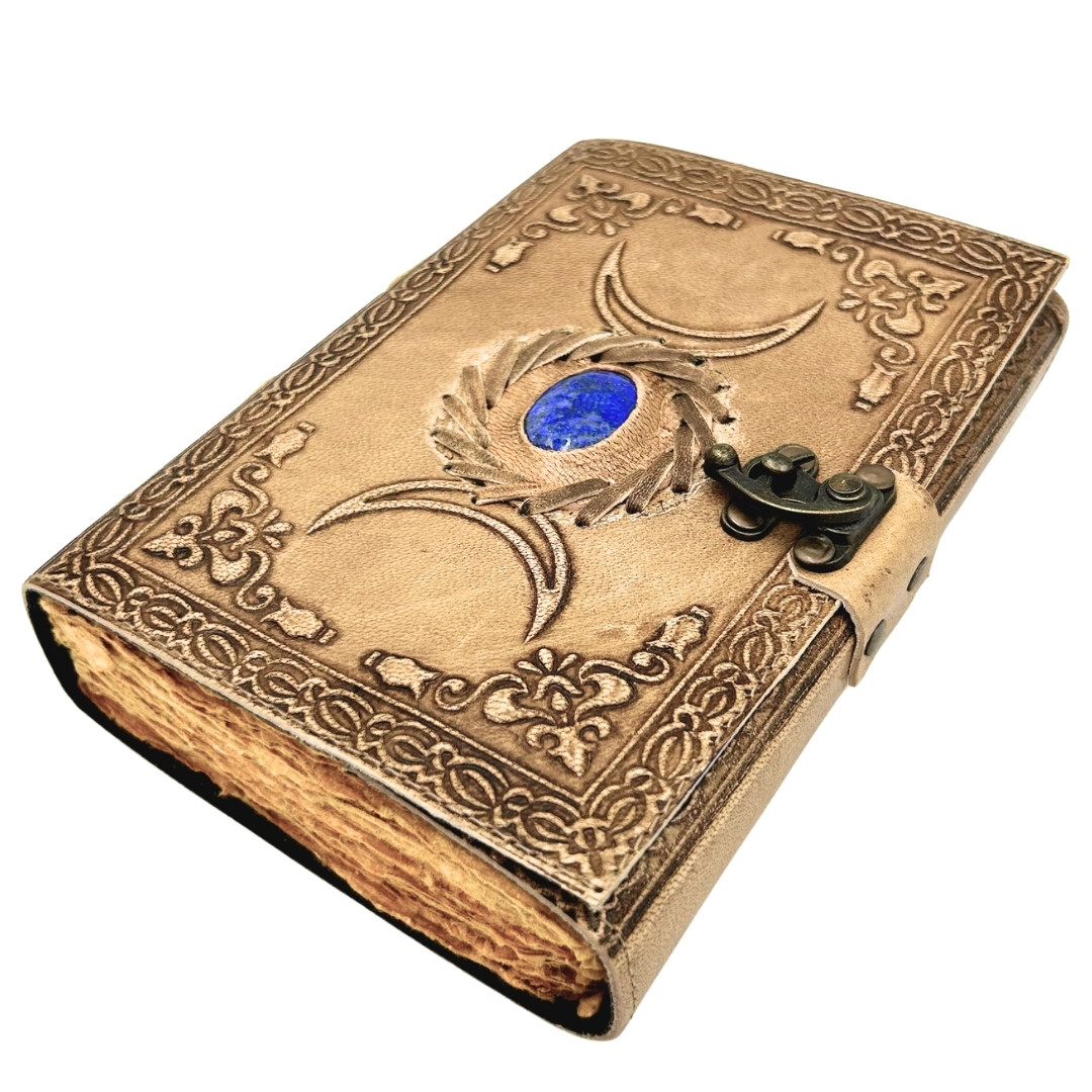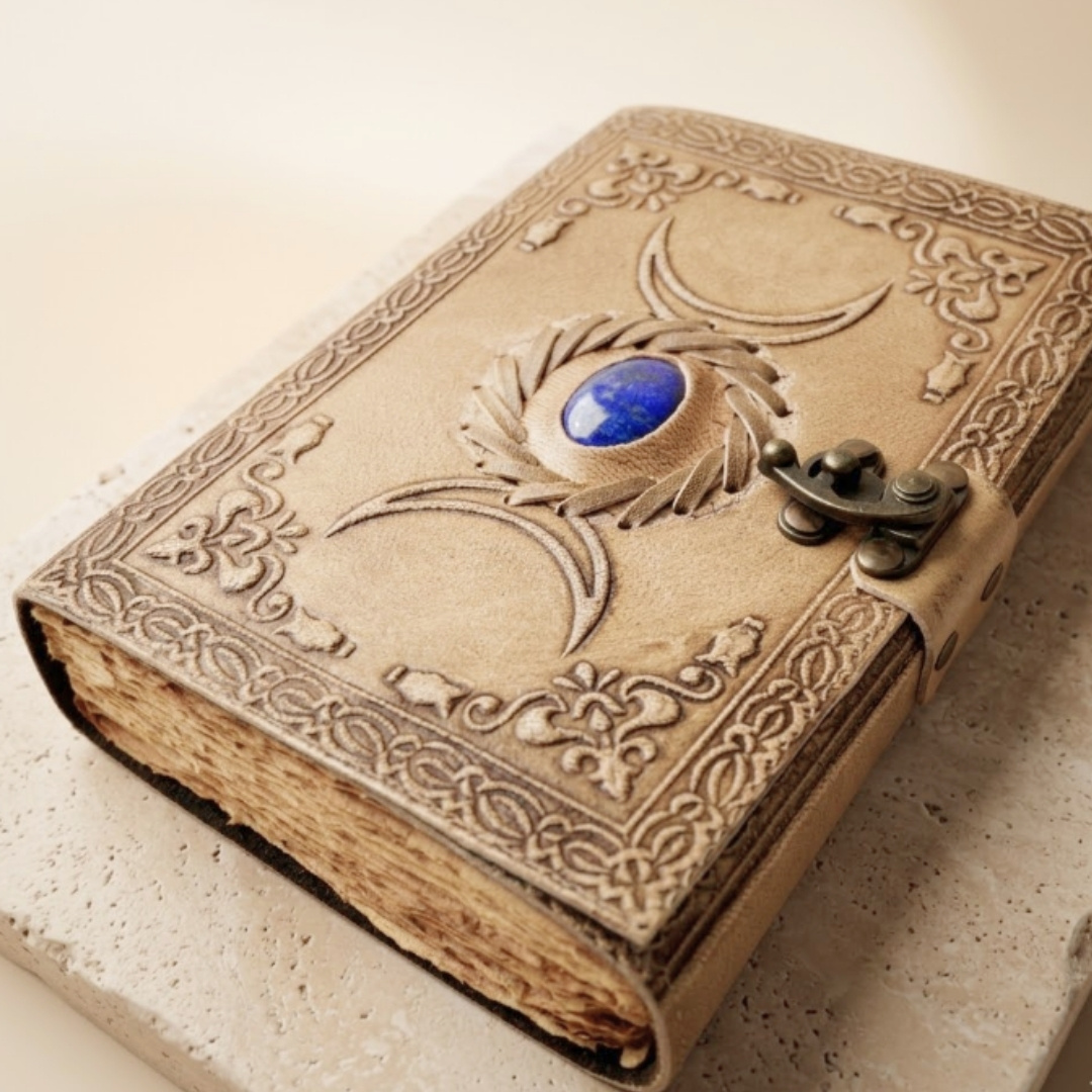 Wyjątkowy notatnik o mistycznym charakterze, inspirowany symboliką potrójnego księżyca, znaku kobiecej energii, cykliczności i harmonii. Bogato tłoczona okładka z naturalnej skóry, uzupełniona efektownym, niebieskim kamieniem, nadaje mu niepowtarzalny, niemal magiczny wygląd. To przedmiot, który przyciąga spojrzenia i zachęca do tworzenia własnych zapisków. Wewnątrz znajduje się 200 stron (100 kartek). Dzięki wysokiej jakości papier doskonale sprawdza się przy pisaniu piórem, długopisem czy ołówkiem bez ryzyka przebijania. Całość uzupełnia dekoracyjne metalowe zapięcie w stylu retro.