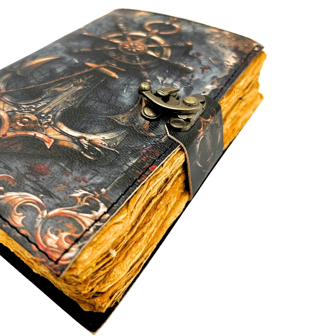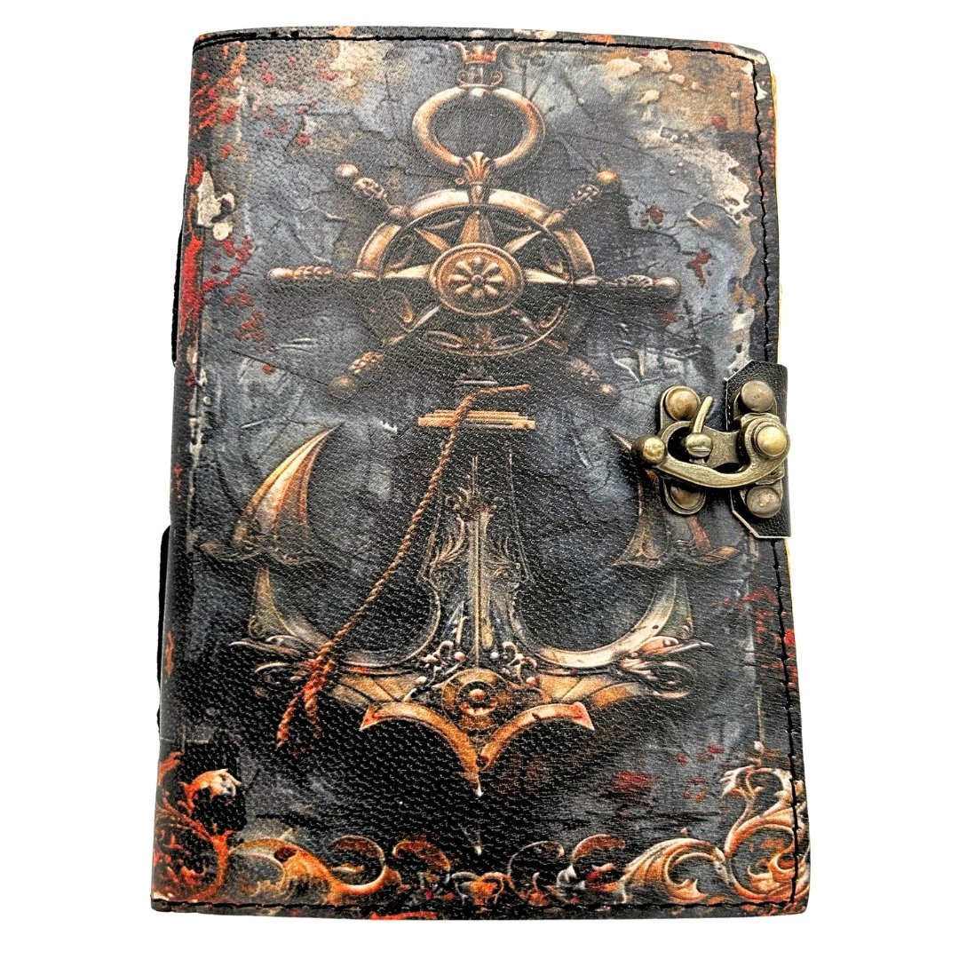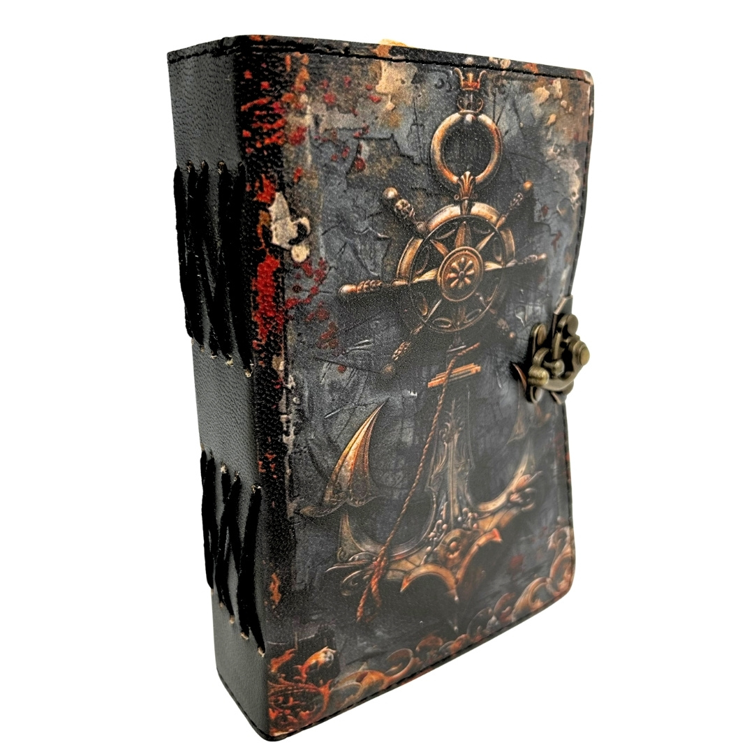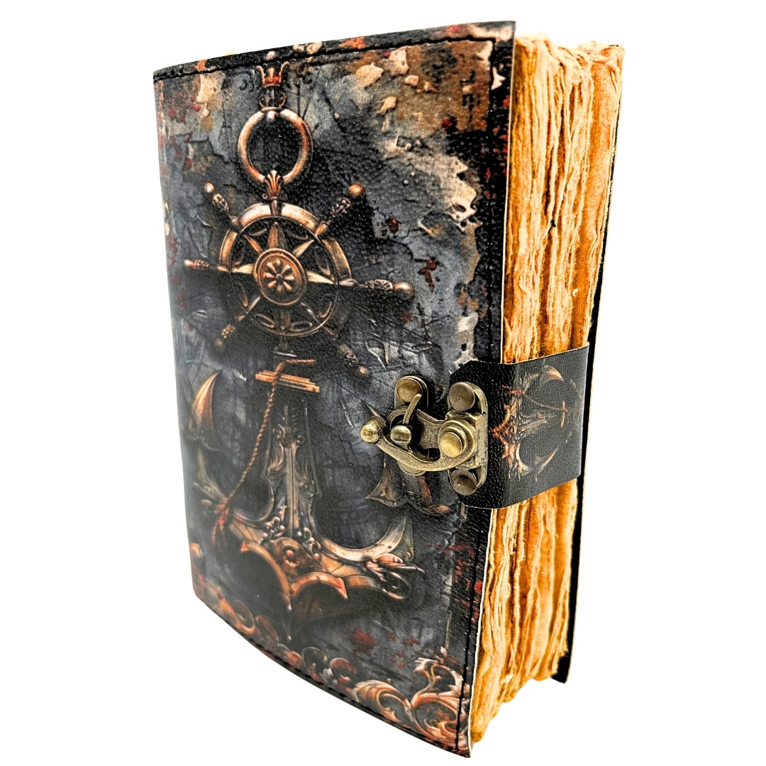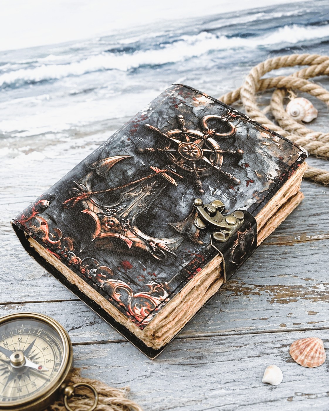 Ten wyjątkowy notatnik to propozycja dla osób, które cenią niepowtarzalny klimat podróży, przygody i dawnych morskich opowieści. Okładka utrzymana w stylu vintage inspirowana jest motywami żeglarskimi. Znajdziemy tu ster okrętowy, kotwicę oraz subtelne, celowo postarzane zdobienia, które nadają całości charakter starego dziennika kapitańskiego. Wewnątrz znajduje się 200 stron (100 kartek). Dzięki wysokiej jakości papier doskonale sprawdza się przy pisaniu piórem, długopisem czy ołówkiem bez ryzyka przebijania. Całość uzupełnia dekoracyjne metalowe zapięcie w stylu retro.