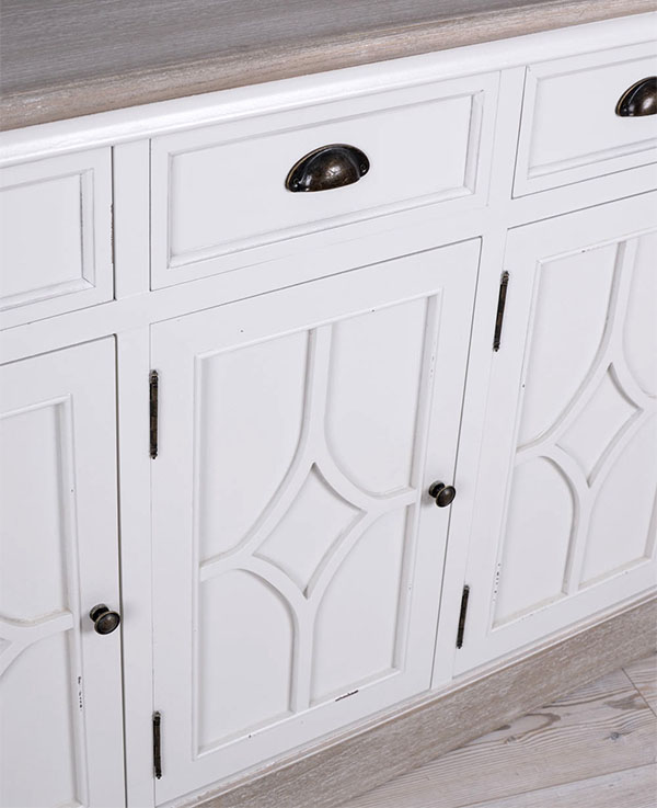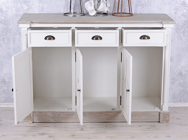 Niezwykle pojemna komoda w stylu rustykalnym. Pod blatem z przecieranego drewna znajdują się trzy szuflady. W dolnej części komody znajduje się ogromna szafka wyposażona w potrójne drzwiczki. Fronty i boki mebla okryte jasną farbą, powierzchnia celowo postarzana w stylistyce shabby chic: przecieranie, patynowanie, nierównomierne położenie farby, imitacja przebarwień i zadrapań. Ręczne wykonanie tych zabiegów ma podkreślać dawny wygląd mebla i sprawia, że każdy egzemplarz ma niepowtarzalny charakter.