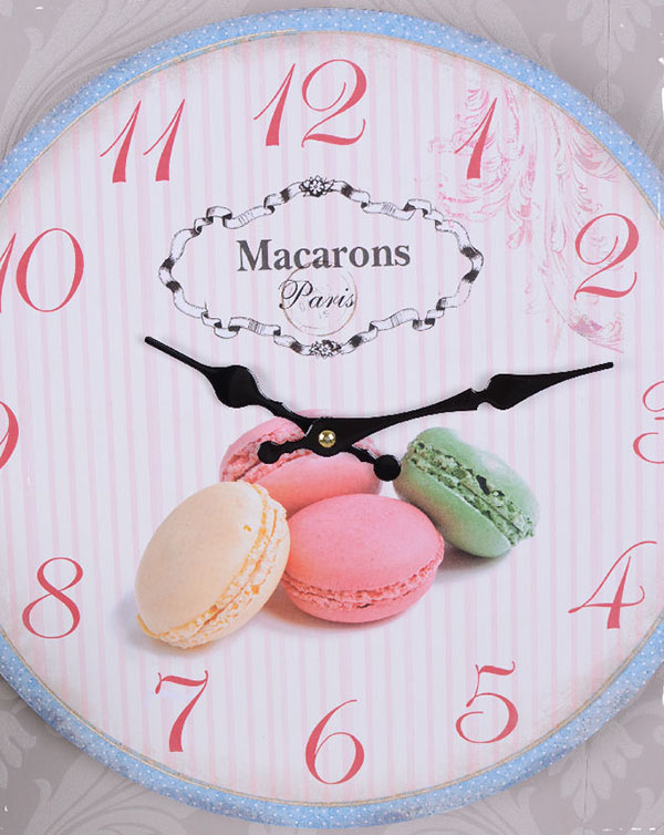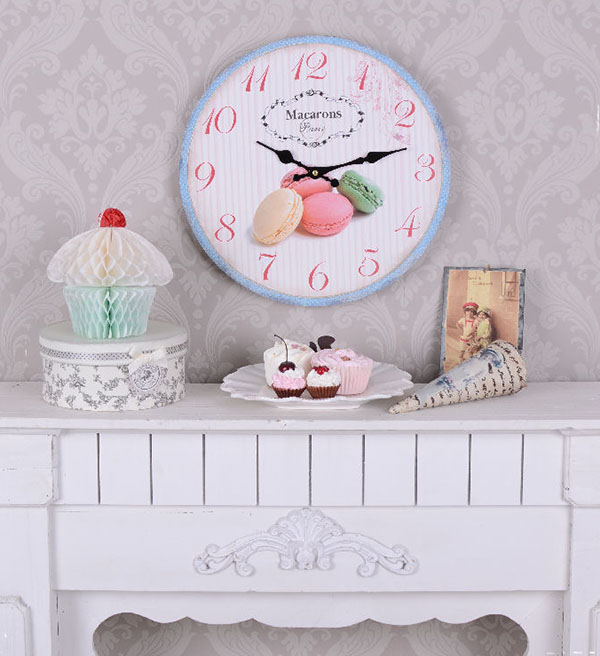 Uroczy zegar ścienny w stylu retro. Utrzymany w pogodnej, pastelowej tonacji kolorystycznej. Czarne wskazówki wyraziście odcinają się na tle tarczy z motywem ciasteczek. Powierzchnia zegara została poddana celowemu postarzaniu w formie przetarć i patynowania. Wyposażony w mechanizm kwarcowy na baterię (nie ma w zestawie).
