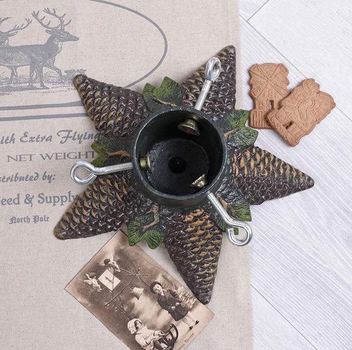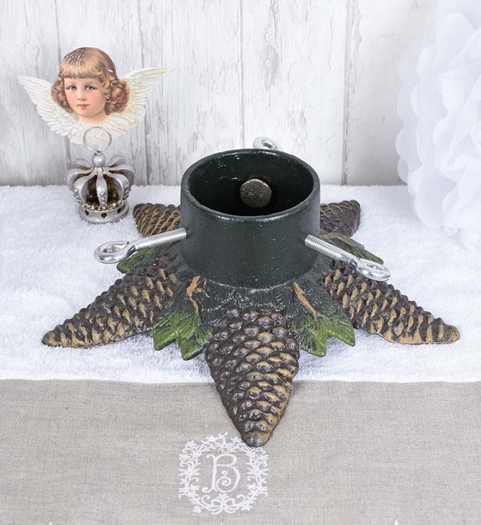 Pięć szyszek, wyjątkowy stojak choinkowy. Podstawa przypomina gwiazdę ułożoną z szyszek, otoczonych igliwiem. Pięć szyszek, wyjątkowy stojak choinkowy, który może zostać wykorzystany również jako świecznik lub samodzielna dekoracja. Stojak waży około 3 kg i jest przeznaczony do osadzenia drzewka o średnicy pnia do 8 cm. Stabilne mocowanie umożliwione jest przez dokręcenie trzech śrub.