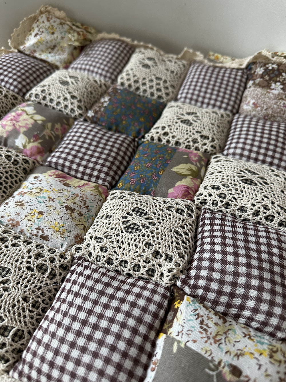 Piękna pikowana poduszka o optyce patchworkowej. Poszycie wykonane z miękkiej tkaniny zostało poprzeszywane w niewielkie kwadraty. Każdy z nich wypełnia inny, niż sąsiedni wzór. Sześć kwadratów zawiera różne motywy. Poduszka obszyta delikatną koronkową taśmą, która dodaje jej niezwykłego uroku.