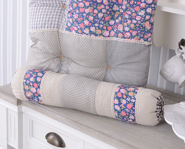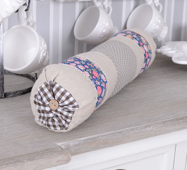 Niezwykle oryginalna poduszka w formie wałka. Utrzymana w stylu rustykalnym. Tkanina w naturalnym odcieniu została wzbogacona dwoma pasami materiału w drobne różyczki i centralnie poprowadzonym pasem w białe kropeczki. Boki wałka, w brązowo-białą kratkę, wykończone dużymi guzikami.