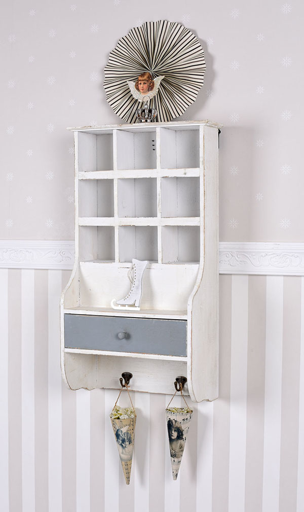 Ścienny regał z przegródkami, styl prowansalski. Niecodzienne zestawienie półek podzielonych na dziewięć kwadratowych sekcji z szufladą i dwoma wieszakami. Takie połączenie zapewnia dużą funkcjonalność mebla.