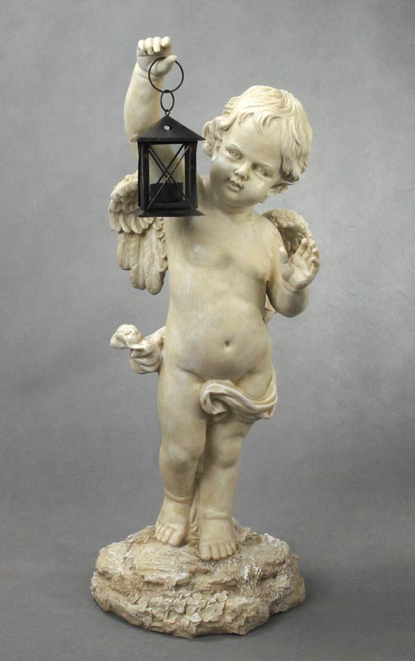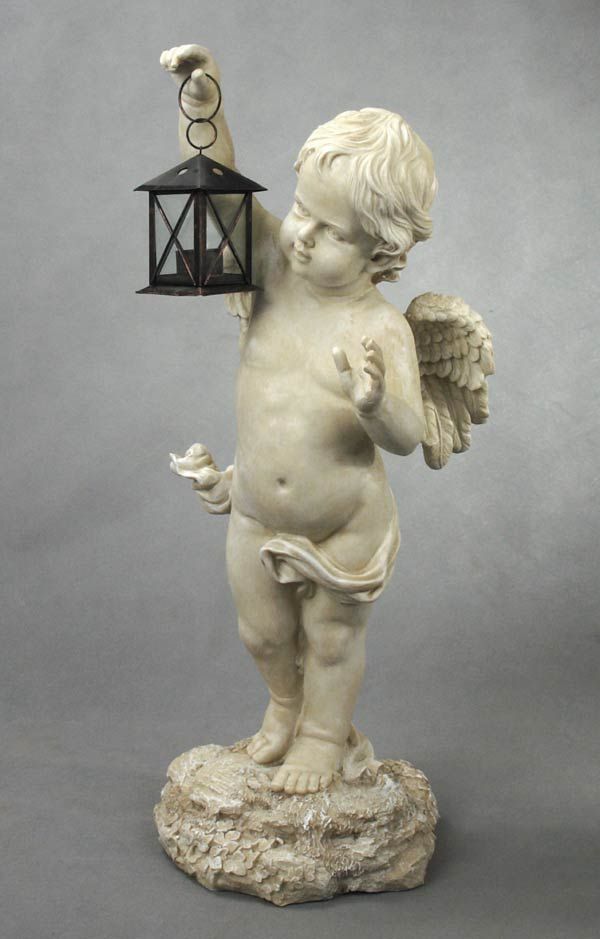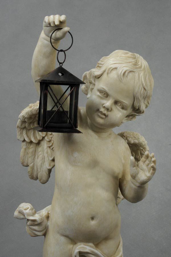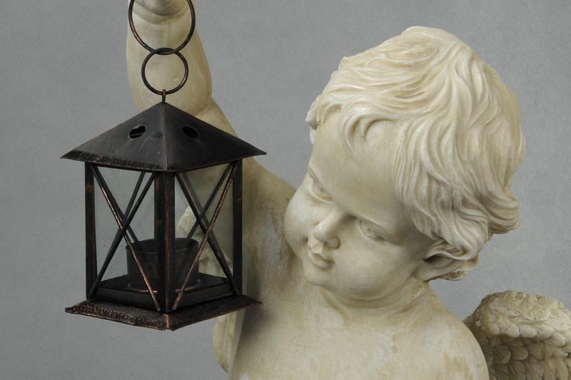 Przepiękna, wysoka figura stojącego anioła, trzymającego w ręku latarenkę na jedną świeczkę. Aniołek przedstawiony w kojarzący się z barokiem sposób, jako uśmiechnięty, pucołowaty chłopczyk. Bardzo romantyczna kompozycja, odporna na warunki atmosferyczne, dzięki czemu świetnie sprawdzi się jako stylowa dekoracja ogrodu i tarasu. Efektownie prezentuje się na wysokiej kolumnie. Będzie również ciekawym akcentem rustykalnej aranżacji wnętrza salonu, czy też sypialni.