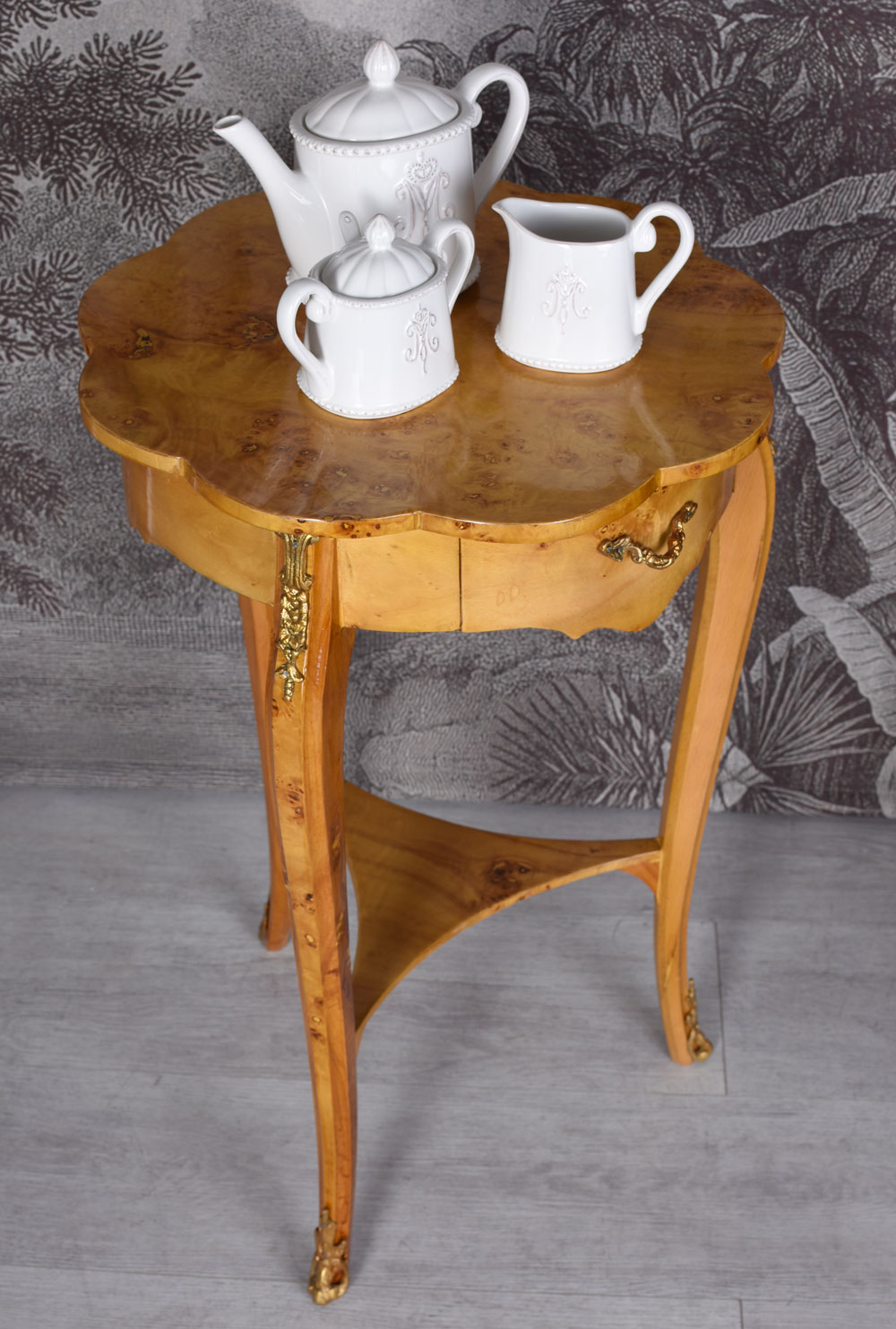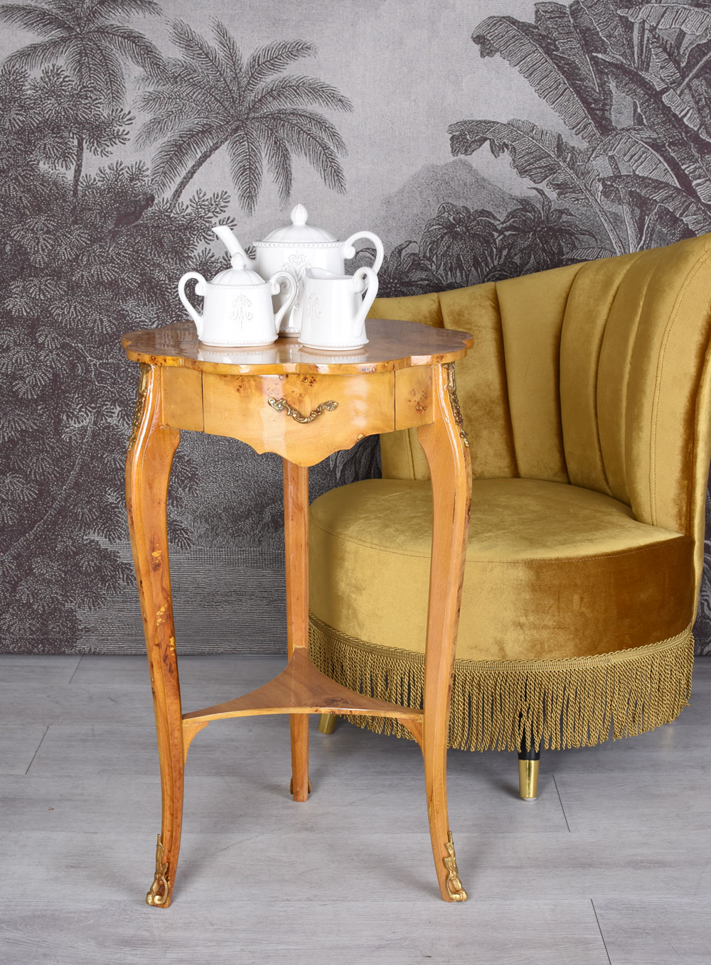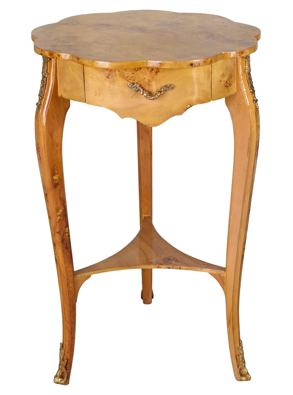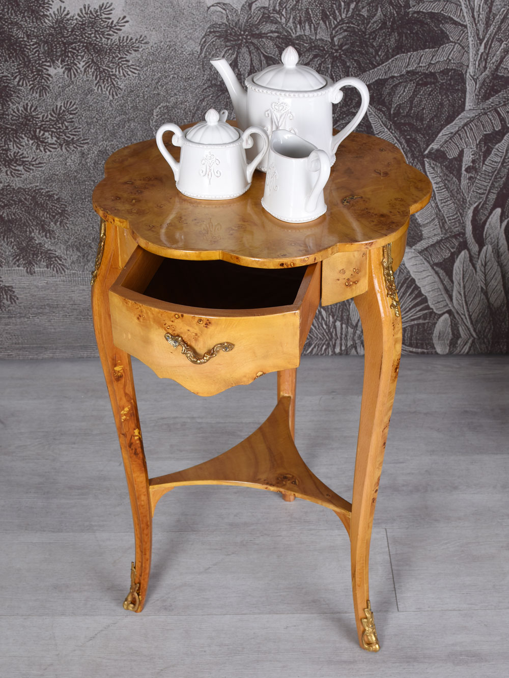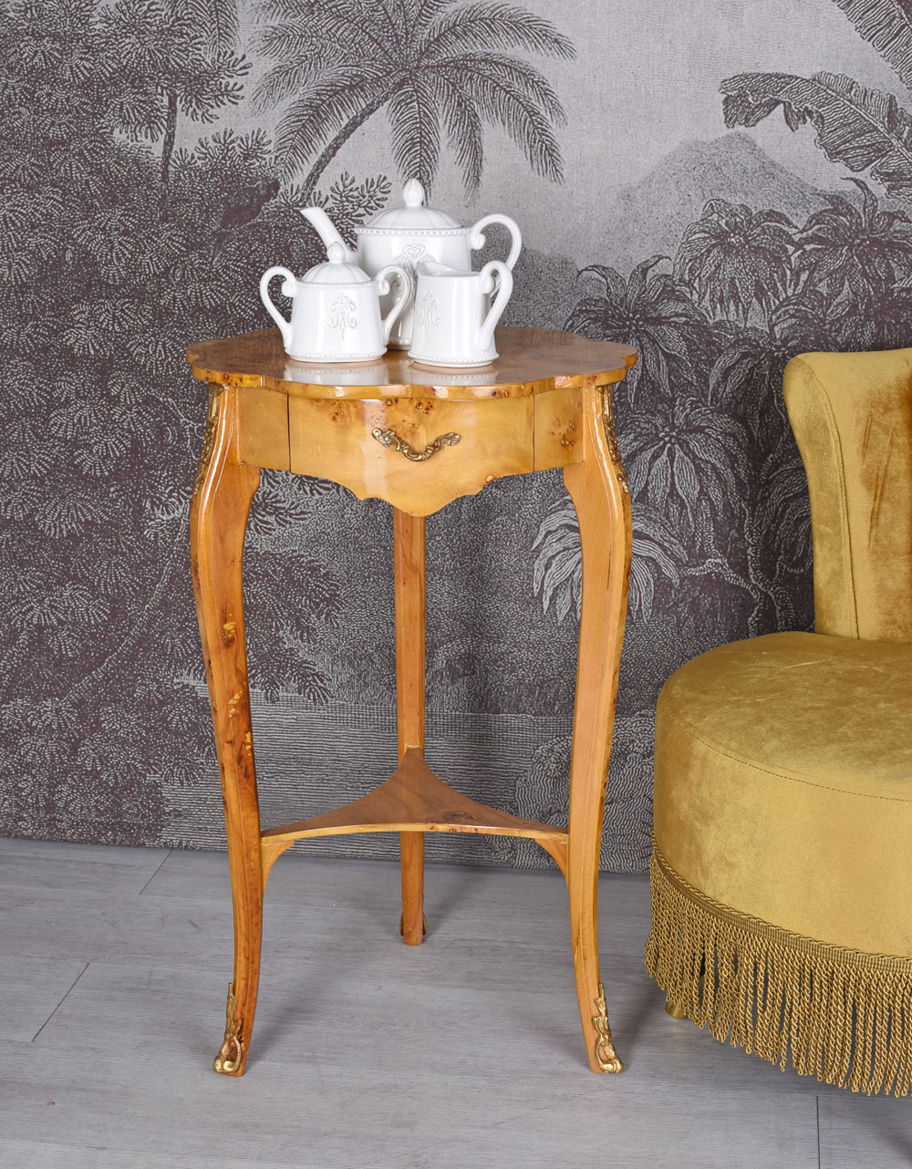 Stolik z szufladką w stylu barokowym. Fantazyjny blat o falistej linii doskonale współgra z wykończeniem frontów. W dolnej części umieszczona mała półeczka, która stanowi dodatkowe wzmocnienie.