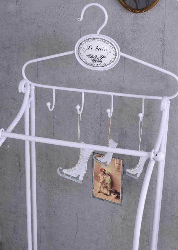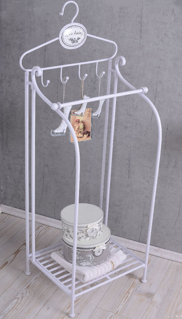 Stojąca suszarka łazienkowa w stylu prowansalskim. Zwieńczenie w kształcie wieszaka ubraniowego z medalionem, na którym widnieje napis „Le bain” (fr. „kąpiel”). Obecność czterech wieszaków i dodatkowego drążka sprawia, że suszarka jest wyjątkowo praktyczna. Podstawa wyposażona w półkę. Suszarka pokryta farbą w odcieniu bieli. Powierzchnia przecierana i patynowana, co stwarza pozory wiekowości.