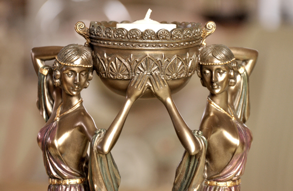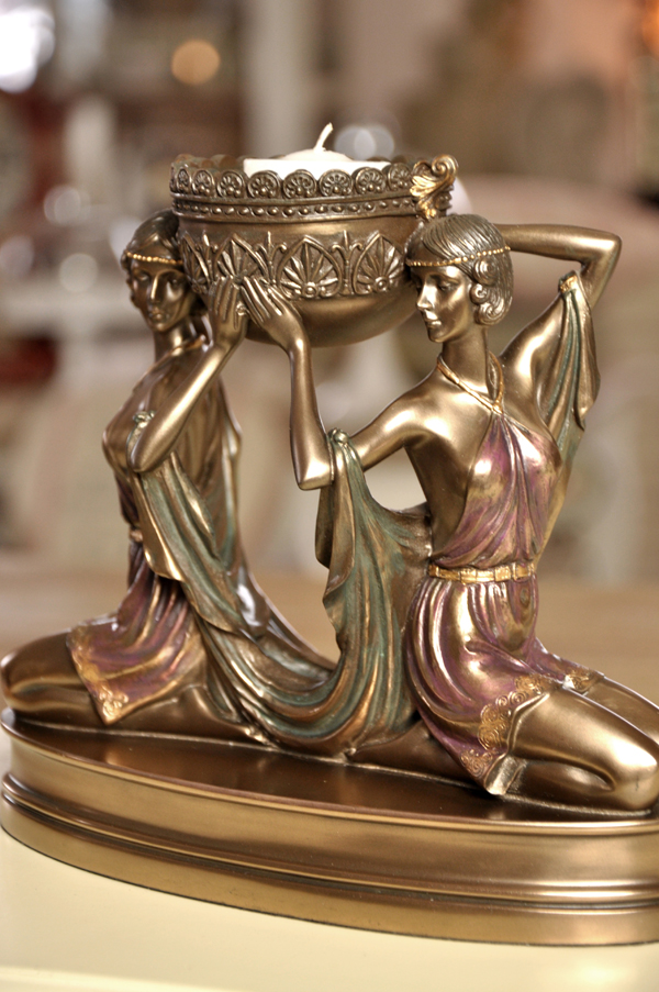 Niezwykle elegancki świecznik z figurami kobiet w stylu art deco. Postacie tancerek, które podtrzymują pojemnik na świece są niezwykle starannie wykończone, bardzo subtelne i gustowne. Pojemnik na świeczkę zdobi ciekawy motyw roślinny. Są to elementy zdobnicze charakterystyczne dla lat dwudziestych XX wieku. Cała kompozycja opiera się na stabilnej podstawie, dzięki czemu można ją bez problemu ustawić na komodzie, szafce, półce wiszącej czy biurku. Świecznik w stylu art deco wykonany jest z materiałów najlepszej jakości. Powierzchnia została pokryta warstwą brązu, co jeszcze podkreśliło luksusowy charakter przedmiotu.