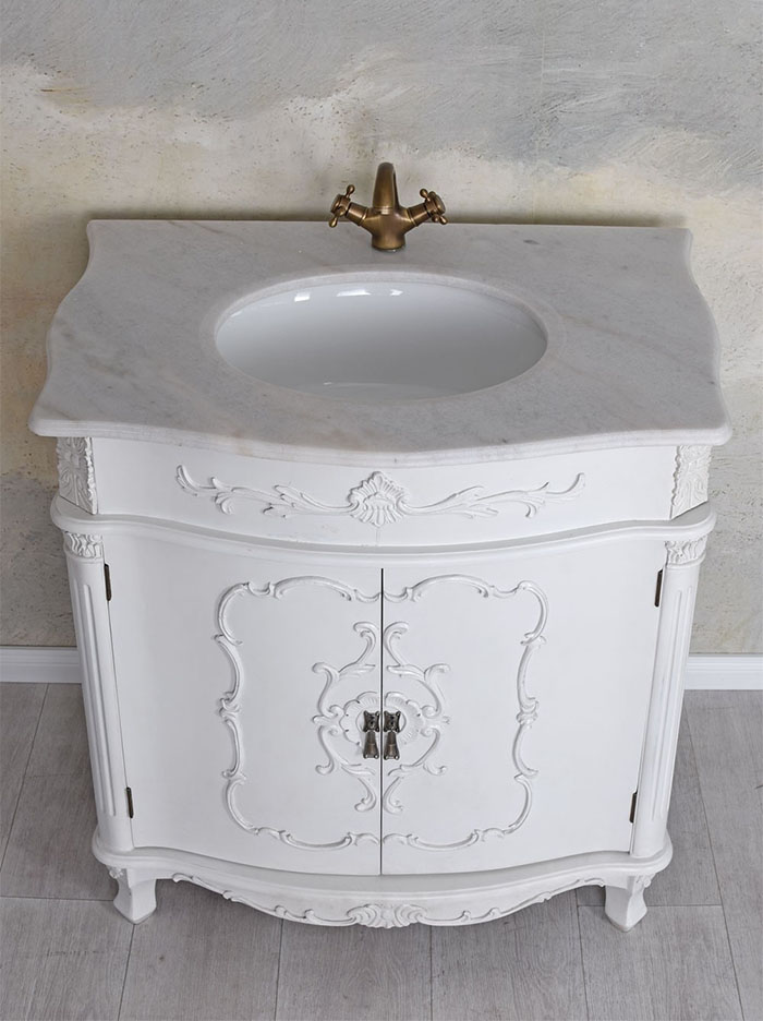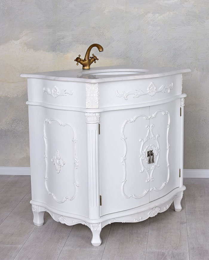 Wyjątkowa szafka łazienkowa z umywalką w stylu vintage. Piękne snycerskie dekory zdobiące front pod umywalką, ranty szafki i przestrzeń między profilowanymi przednimi nóżkami, nawiązują do XVIII-wiecznych motywów zdobniczych. Dwuskrzydłowe drzwiczki wyposażone w dekoracyjne uchwyty. Niezwykłe połączenie funkcjonalnego wyposażenia z dekoracyjnym wykończeniem sprawia, że każda łazienka może stać się królestwem relaksu w stylowym wydaniu.