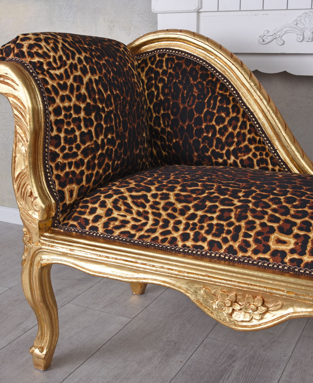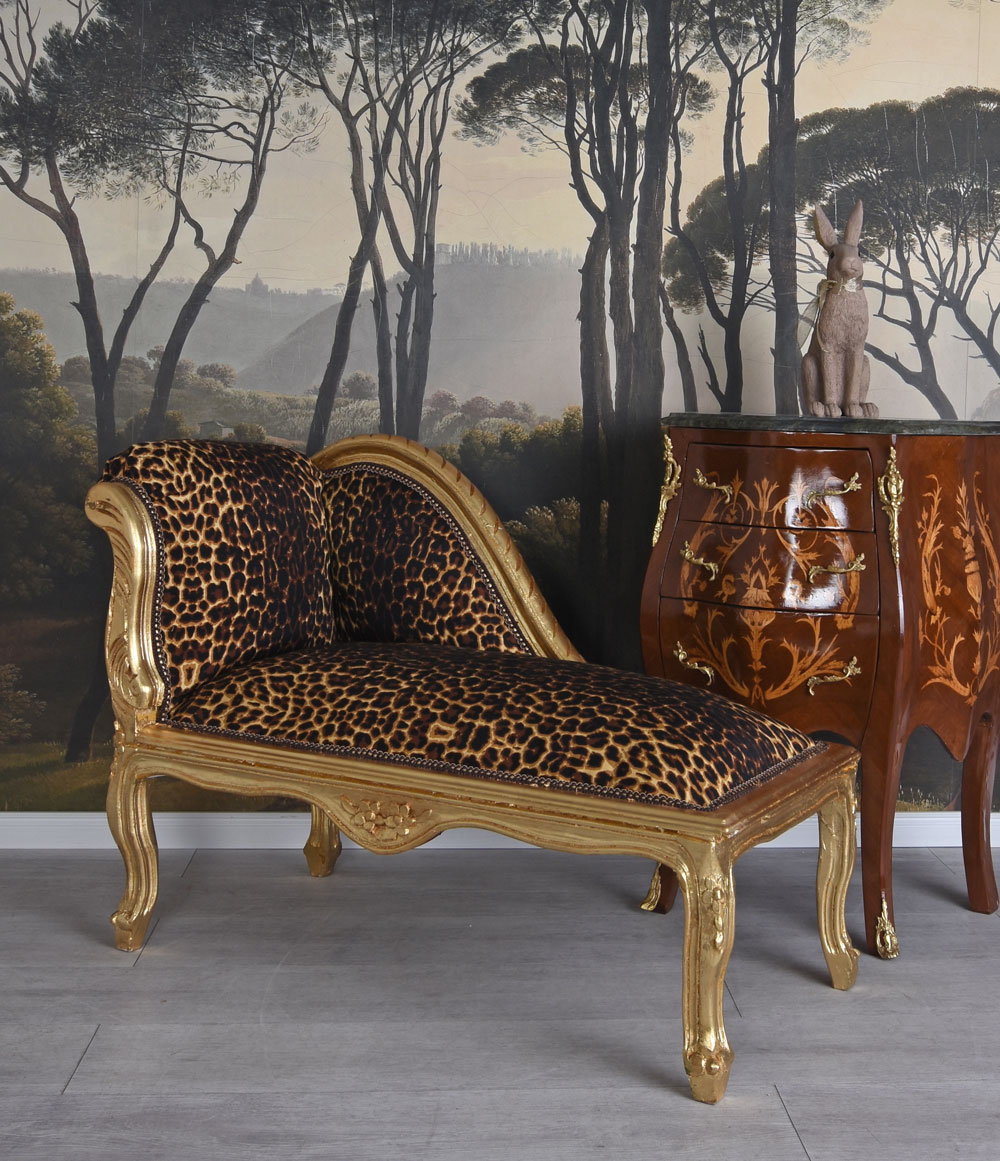 Szykowny szezlong w panterkę w stylu barokowym. Snycerskie zdobienia nóg, podstawy i oparcia to wynik inspiracji sztuką zdobniczą z przełomu XVIII i XIX wieku. Optyka złota dodaje im przepychu i doskonale współgra z modnym wzorem cętek leoparda. Delikatne przecieranie i patynowanie imituje wiekowość mebla.