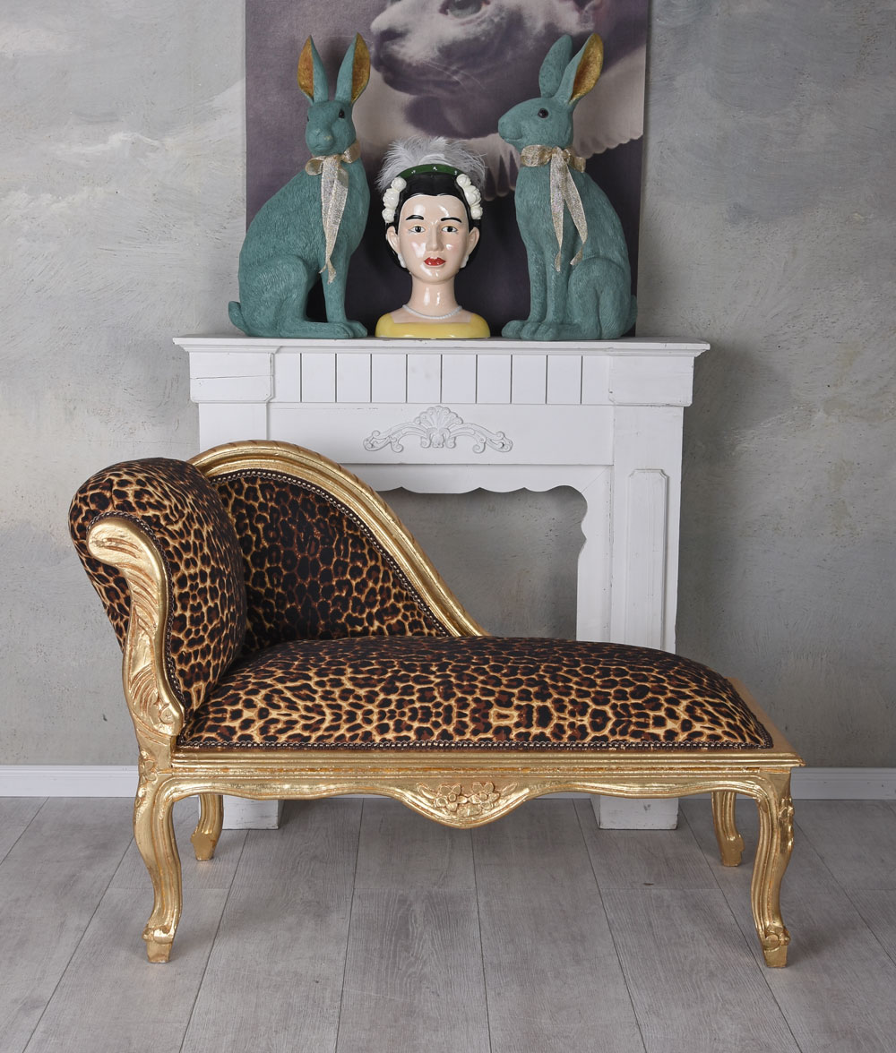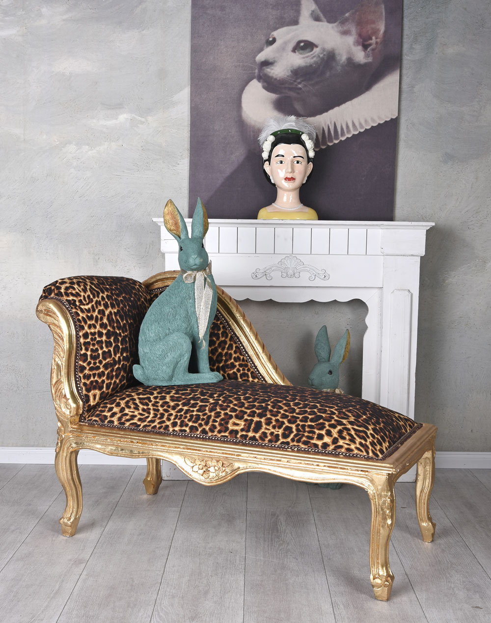 Elegancki szezlong w stylu barokowym. Połączenie historycznej formy z tapicerką w panterkę spodoba się wszystkim, którzy lubią odważne zestawienia.