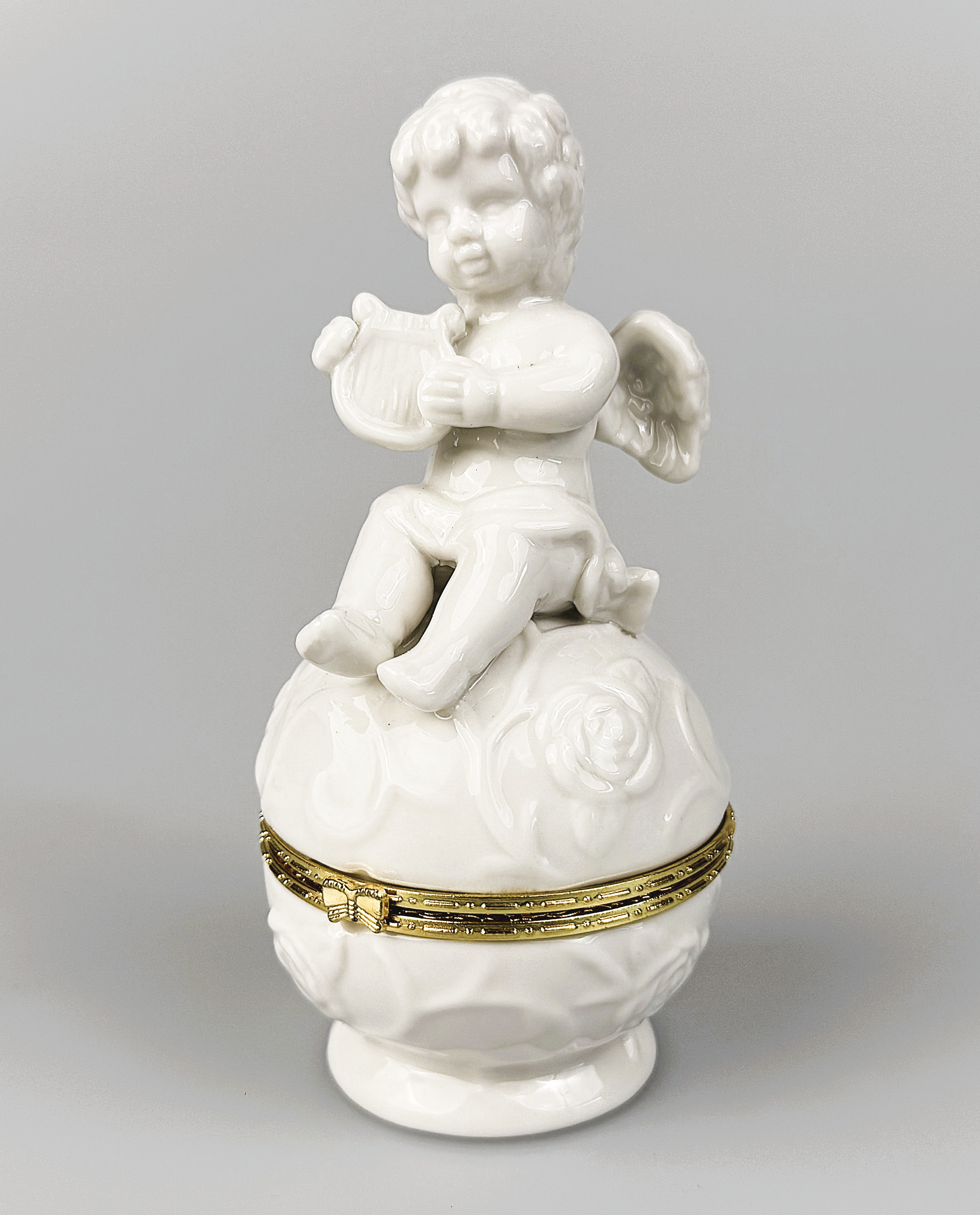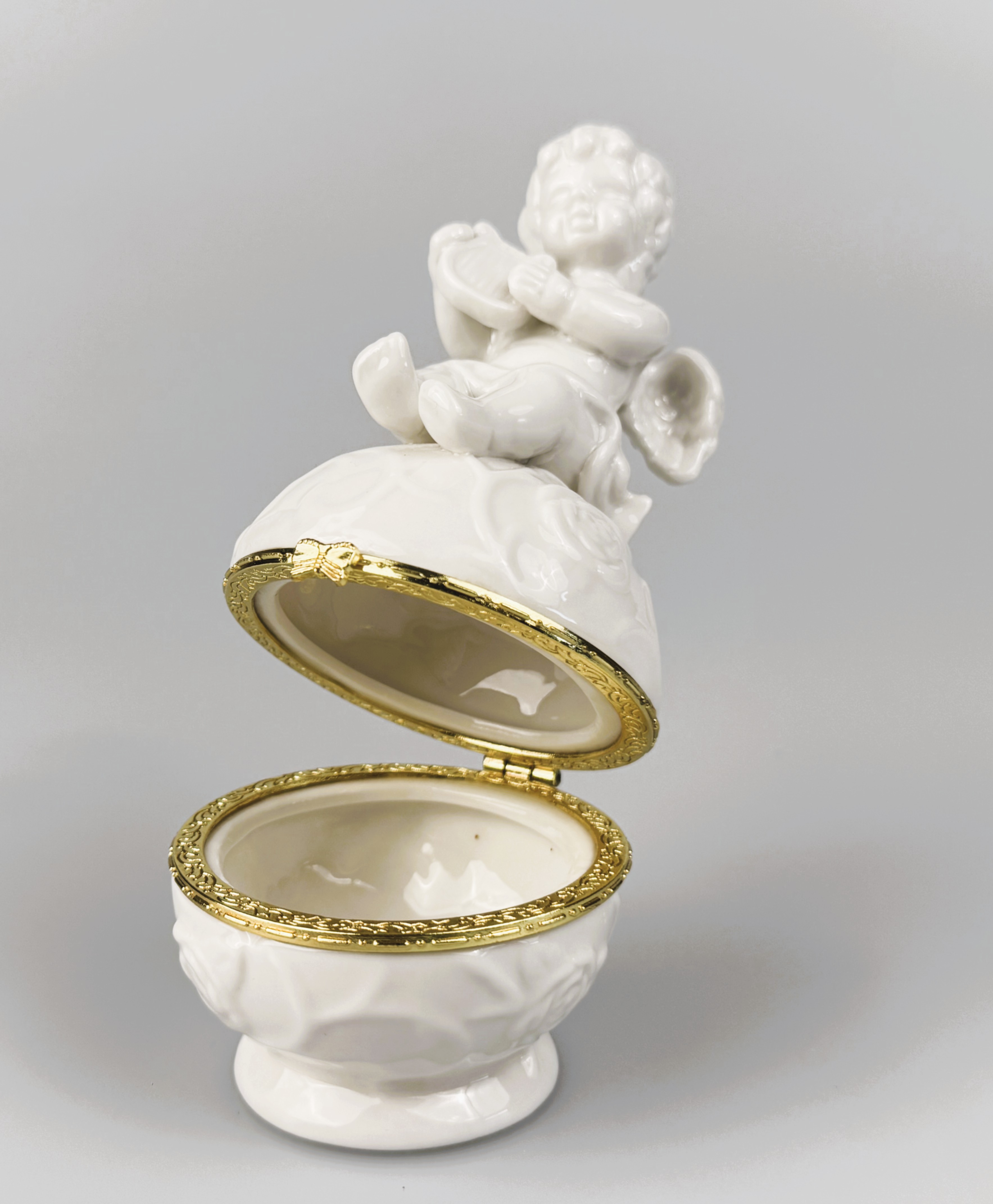 Porcelanowa szkatułka z figurką aniołka z lirą siedzącego na kuli. Wyjątkowa na drobny prezent, również jako eleganckie opakowanie na drobną biżuterię z okazji uroczystości i świąt religijnych takich jak Chrzest św., czy I Komunia Świetej.