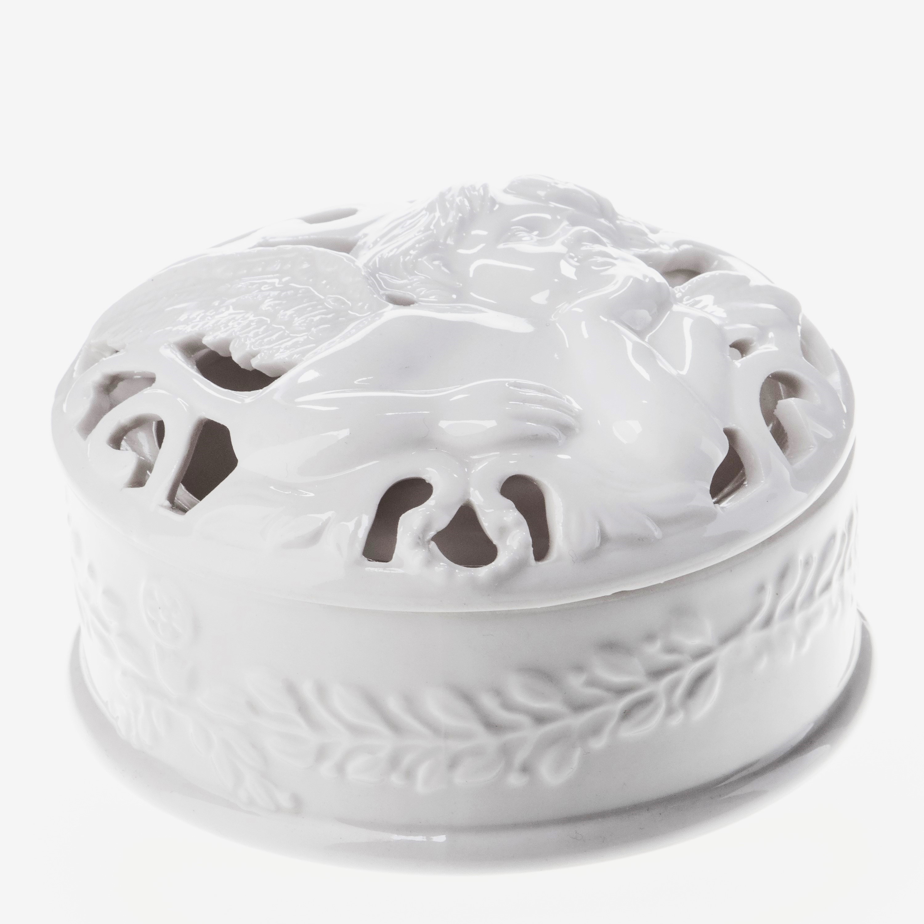 Okrągła szkatułka z wizerunkiem aniołka na wieczku, wkomponowanym w ażurowe motywy. Uroczy przedmiot na drobny upominek przy różnych okazjach. Może również służyć jako ekskluzywne "opakowanie" na bardziej kosztowny drobiazg.