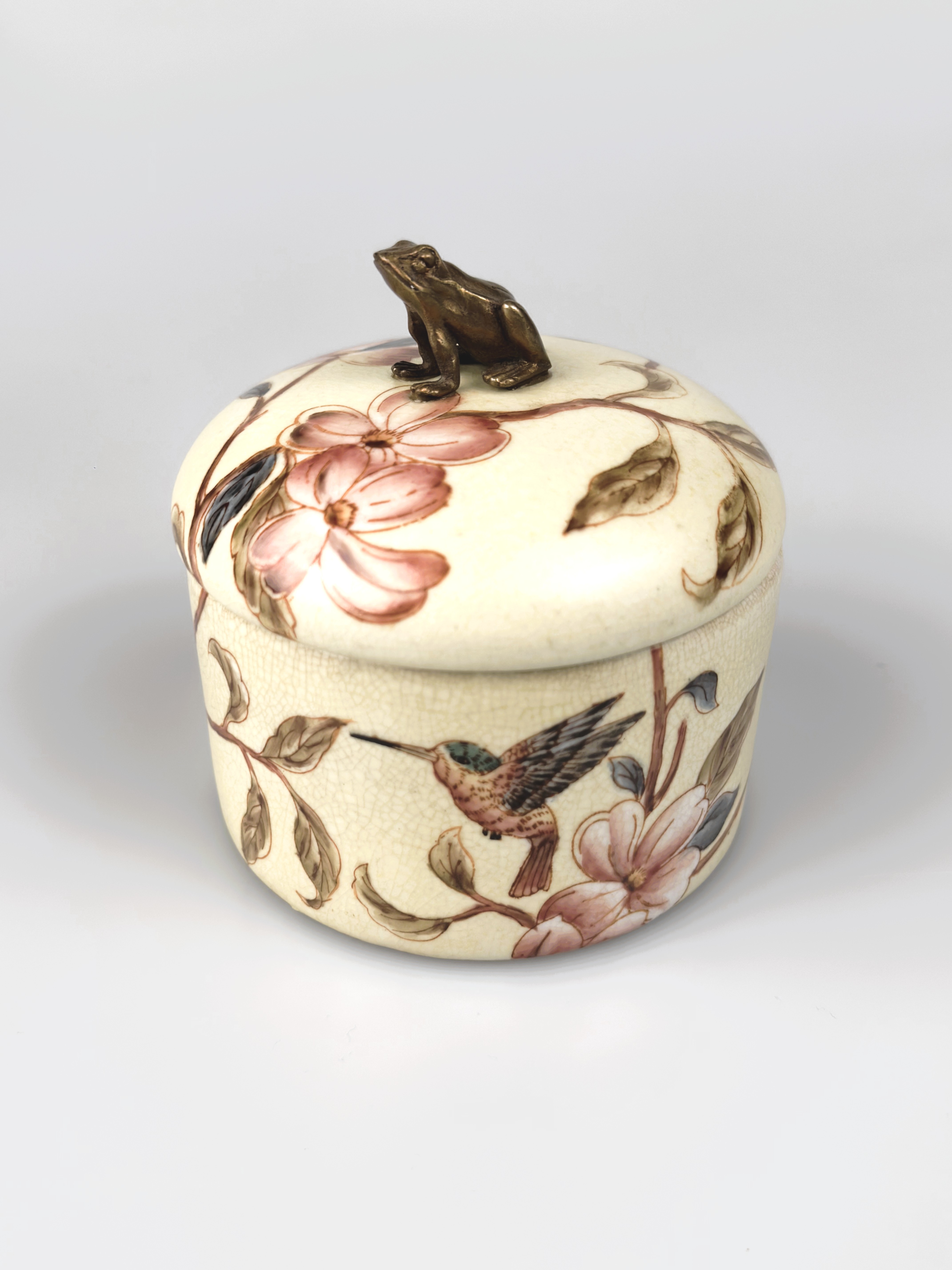 Stylowa szkatułka zdobiona pięknymi motywami roślinnymi i wizerunkami kolibrów. Porcelana o krakelurowym szkliwie ma podkreślać historyczny charakter przedmiotu. Uchwyt dekielka w formie figurki uroczej żabki z ręcznie cyzelowanego brązu. Dobry pomysł na elegancki upominek przy różnych okazjach.