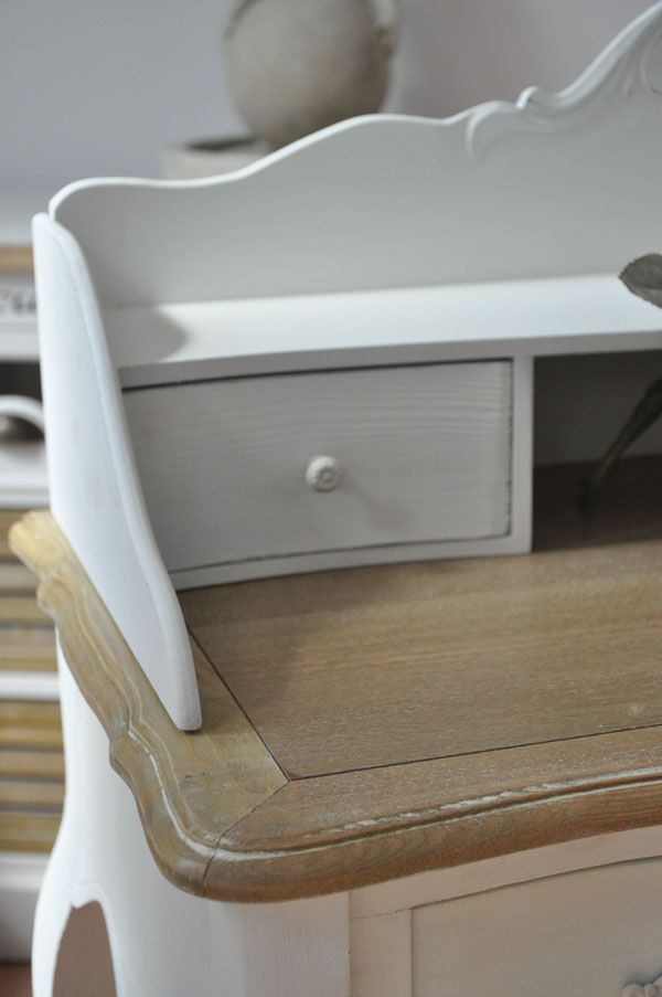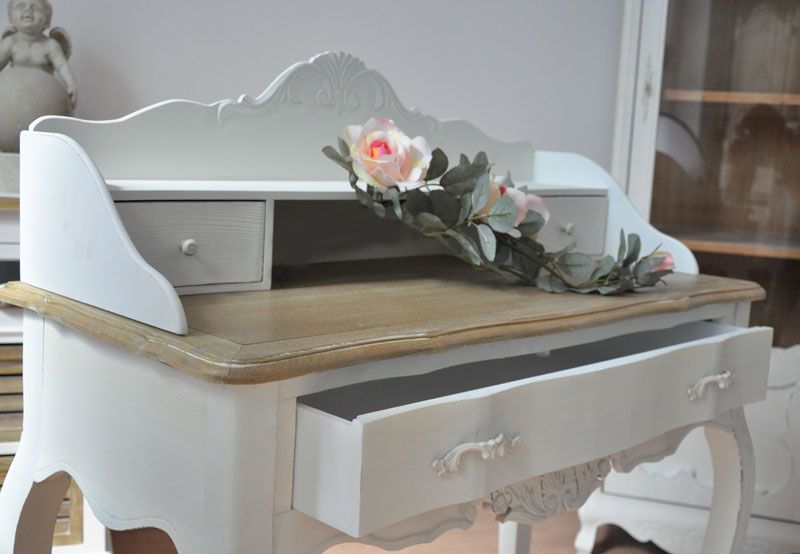 Romantyczne biurko z kolekcji rustykalnej. Konsola biurka wyposażona w jedną dużą szufladę, zaś nadstawka w dwie mniejsze. Na szufladkami umieszczono półkę, która tworzy dodatkową przestrzeń dla artykułów biurowych, lampy, czy niewielkich notesów. Powierzchnia celowo postarzana poprzez nierówne pokrycie farbą i zamierzone ślady użytkowania, przez co biurko to nabiera charakteru starego mebla. Jasny kolor dodaje mu lekkości i uroku. Powierzchnię zdobi również delikatna snycerka w postaci stylizowanych motywów roślinnych oraz eleganckie uchwyty.