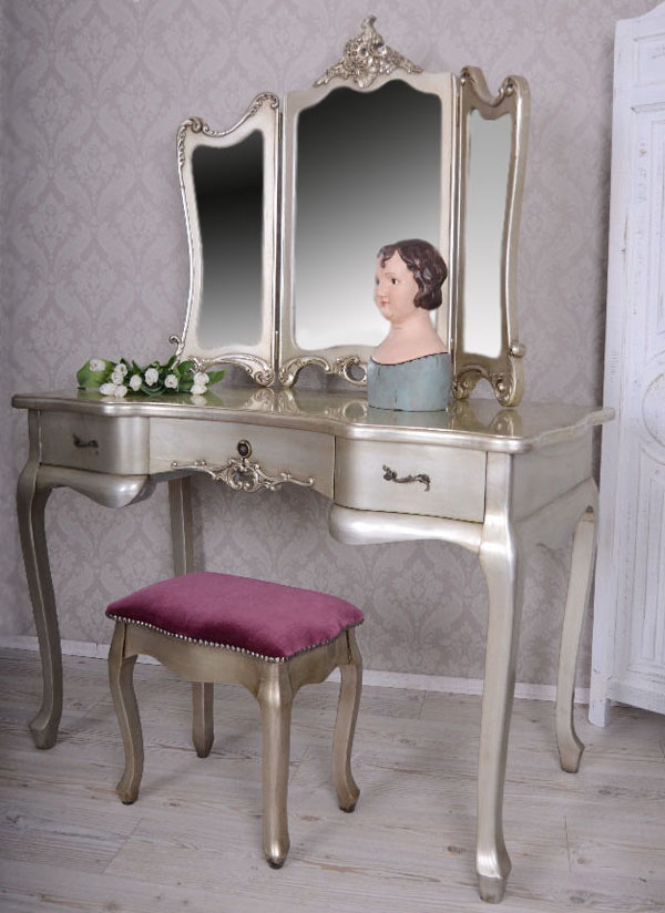 Olśniewająca toaletka w kolorze starego srebra. Na szerokim blacie umieszczono potrójne lustro. Boczne zostały osadzone na zawiasach, dzięki czemu istnieje możliwość regulacji kąta nachylenia. Ramy o fantazyjnej linii zostały wzbogacone pięknymi snycerskimi zdobieniami, które harmonijnie współgrają z wykończeniem środkowej szuflady i okuciami bocznych. Falista linia dodaje lekkości solidnej konstrukcji. Toaletce towarzyszy tapicerowany stołeczek. Faktura i kolor tkaniny podkreślają luksusowy charakter całości.