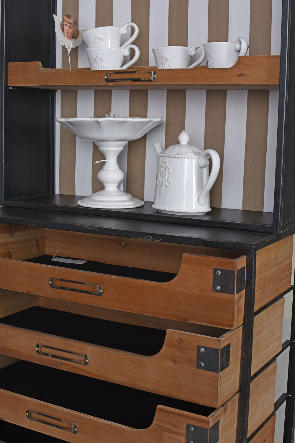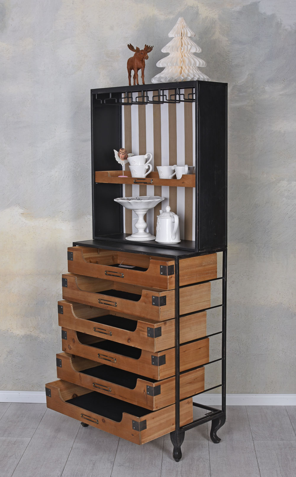 Połączenie surowego drewna i metalu nadaje tej komodzie wyjątkowy, loftowy charakter. Mebel zaprojektowany został z myślą o przechowywaniu butelek wina – w górnej części znajdują się uchwyty na kieliszki oraz dwa poziomy do zagospodarowania według uznania. Sześć szerokich szuflad pozwala uporządkować kolekcję win, akcesoria barowe lub inne drobiazgi. Ten niecodzienny mebel może również pełnić funkcję pojemnej komody na tekstylia, biżuterię, akcesoria dekoracyjne czy narzędzia oraz materiały do zajęć hobbystycznych, tak obecnie modnych.