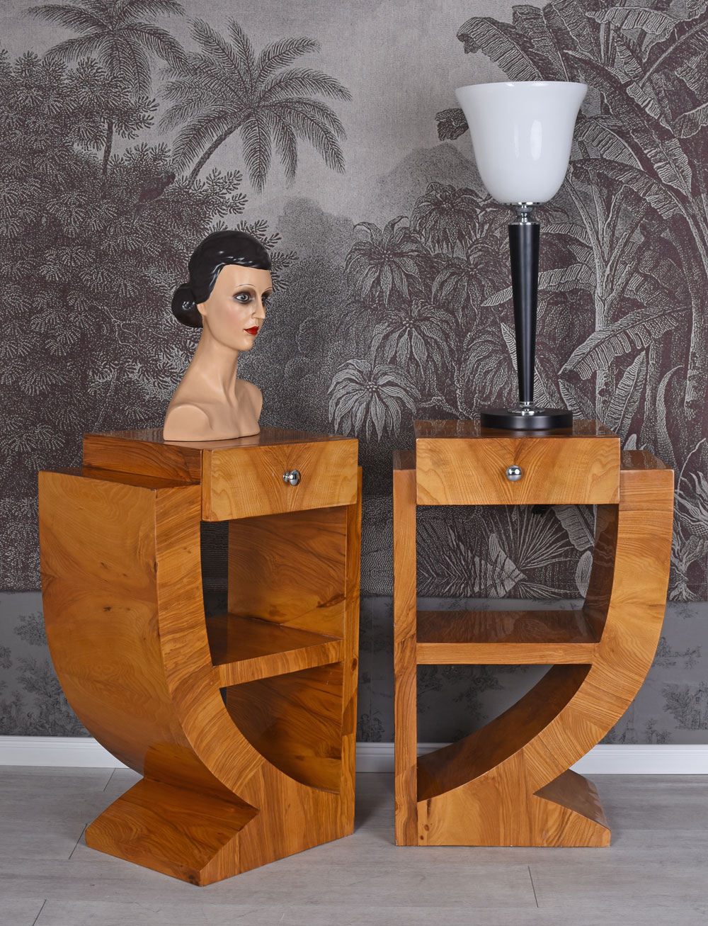 Dwie szafki nocne o niespotykanej formie, w stylu Art Deco. Każda wyposażona w jedną szufladkę i półkę pośrodku. Idealne jako szafki nocne w sypialni lub po prostu dekoracyjne akcenty przyciągające wzrok.