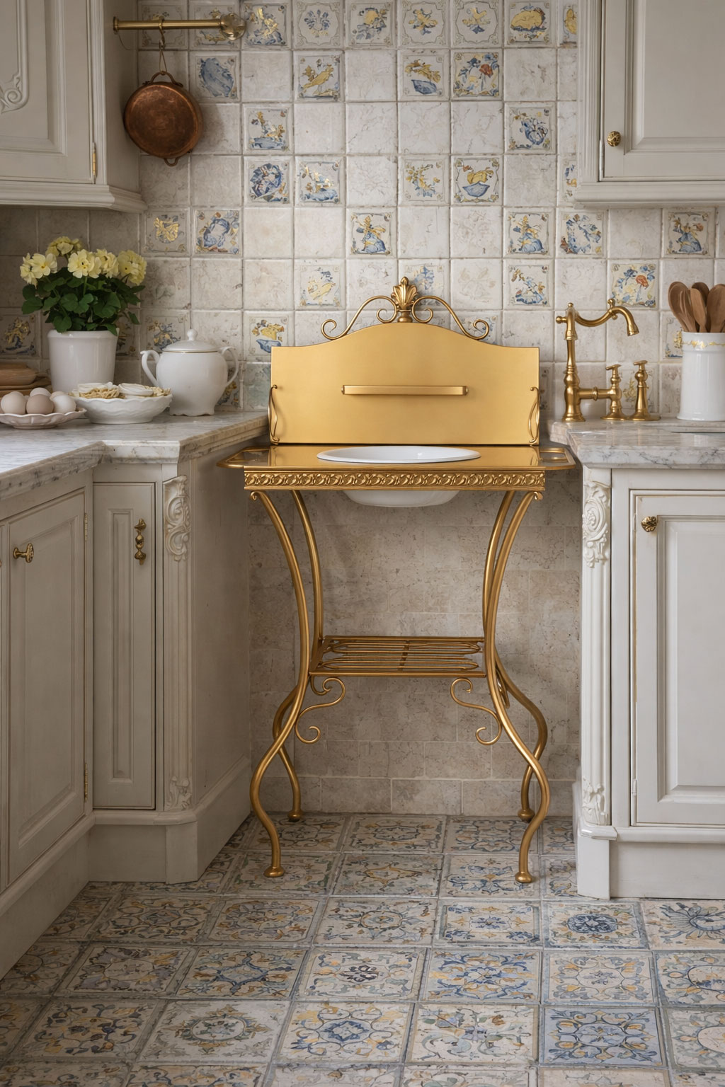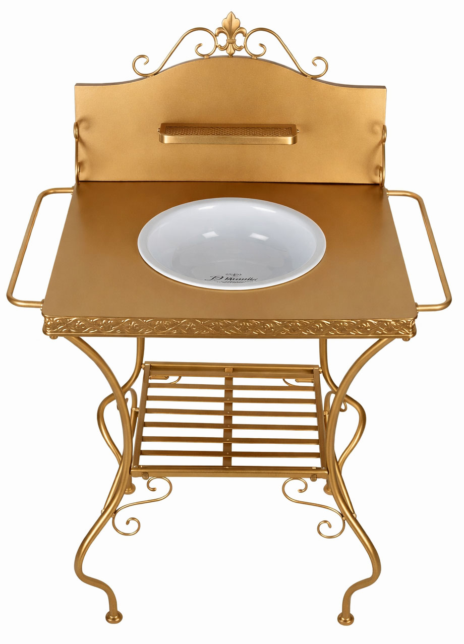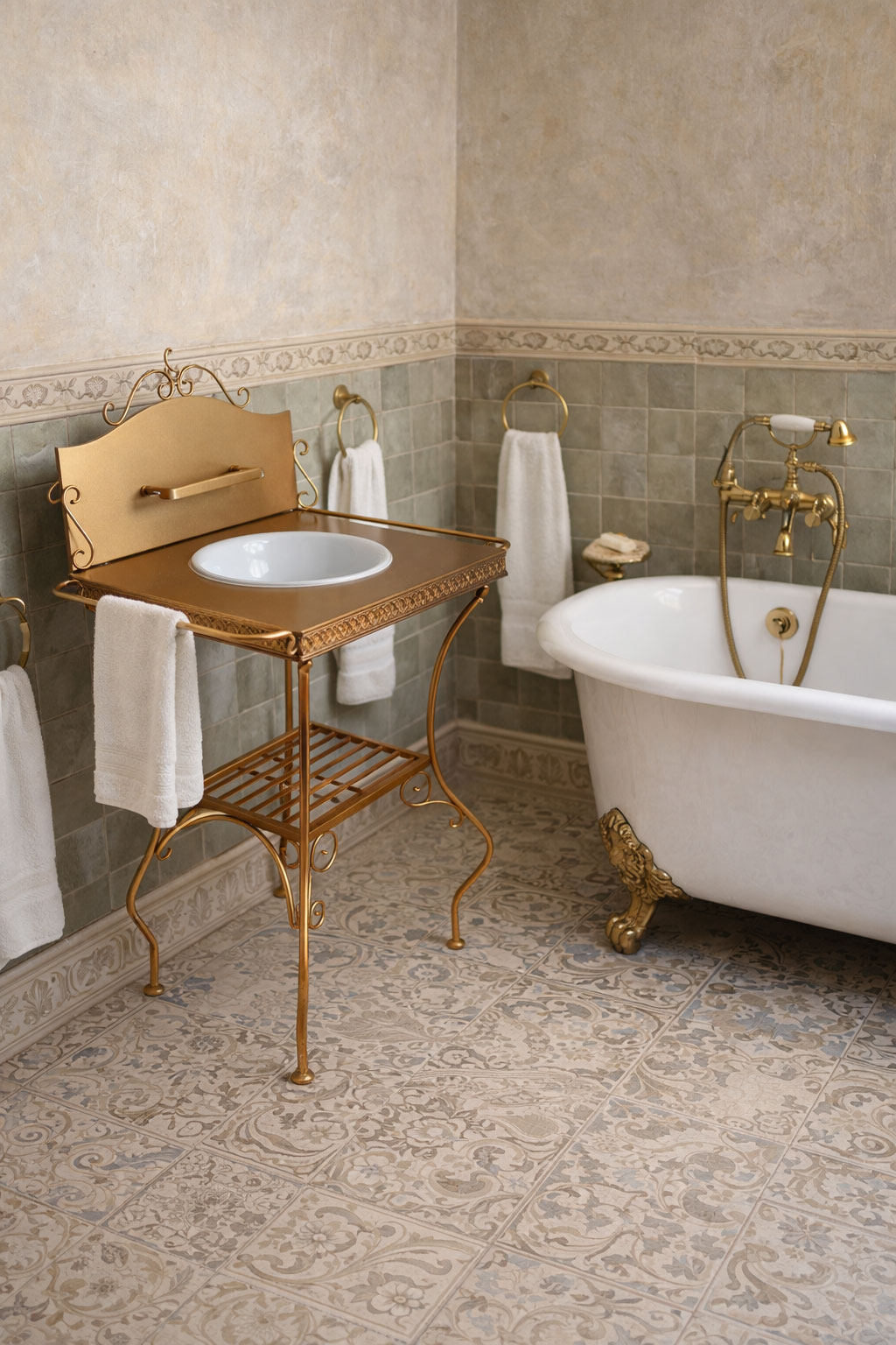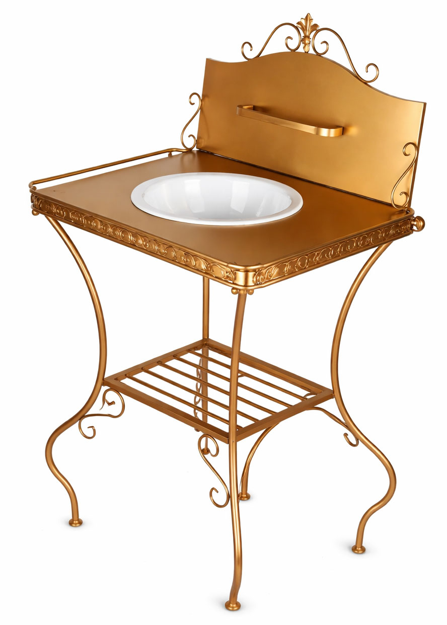 Stylowa umywalka to wyjątkowy element dekoracyjny, który przyciąga uwagę subtelną formą i eleganckim wykończeniem. Jej lekka, ażurowa konstrukcja w odcieniu ciepłego złota nadaje całości szlachetny charakter, doskonale wpisując się w aranżacje vintage, retro oraz klasyczne wnętrza w stylu francuskim. W centralnej części znajduje się praktyczna, wyjmowana misa emaliowana w kolorze bieli, idealna zarówno do funkcji użytkowej, jak i dekoracyjnej. Dodatkowym atutem jest dolna półka, która może służyć do przechowywania ręczników lub akcesoriów łazienkowych, oraz boczne uchwyty zwiększające funkcjonalność mebla.